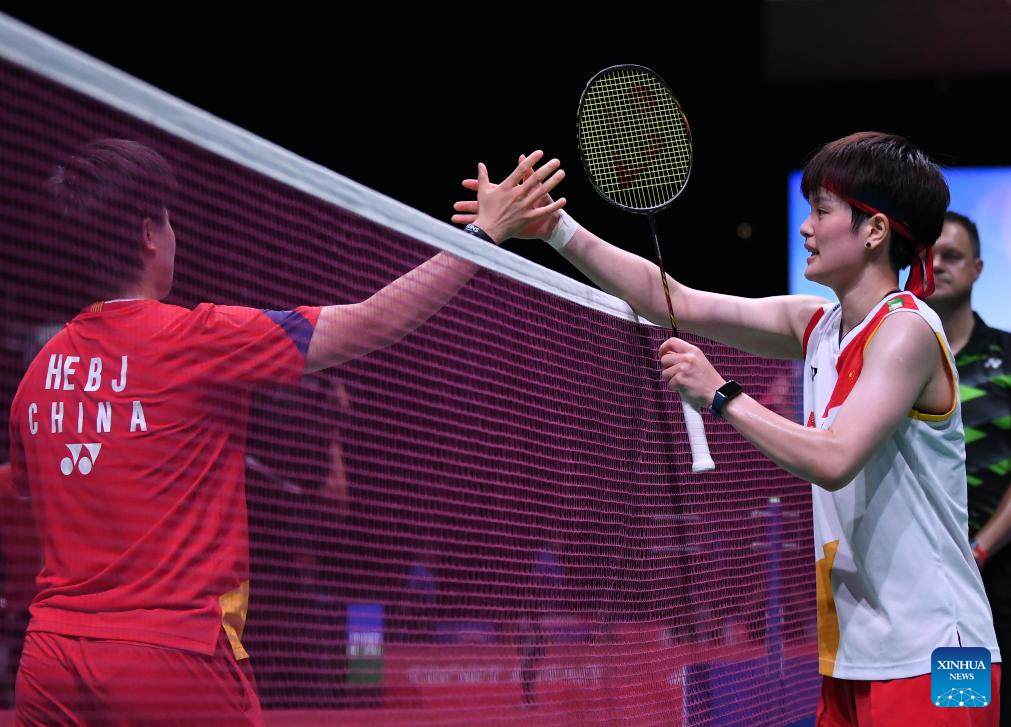 Wang Zhiyi (R) of China greets her compatriot He Bingjiao during the women's singles round of 16 match at the BWF World Championships 2023 in Copenhagen, Denmark, Aug. 24, 2023. (Xinhua/Ren Pengfei)