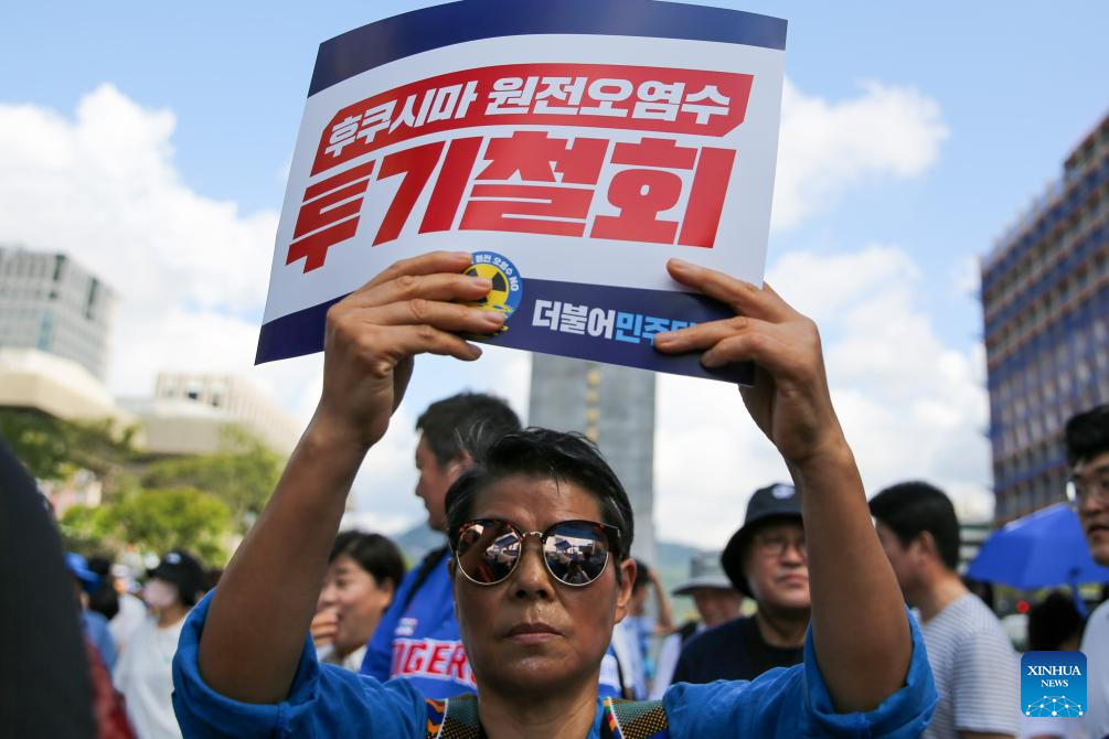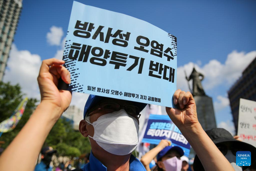 People protest against Japan's decision to release nuclear-contaminated wastewater in Seoul, South Korea, Aug. 25, 2023. Japan started releasing nuclear-contaminated wastewater from the crippled Fukushima Daiichi Nuclear Power Plant into the Pacific Ocean on Thursday, disregarding public concerns and strong opposition from both home and abroad. (Xinhua/Wang Yiliang)