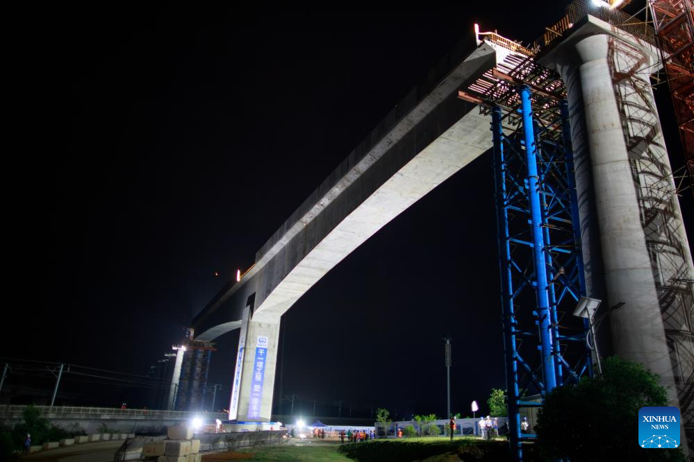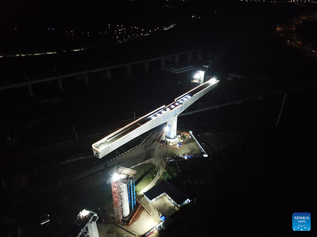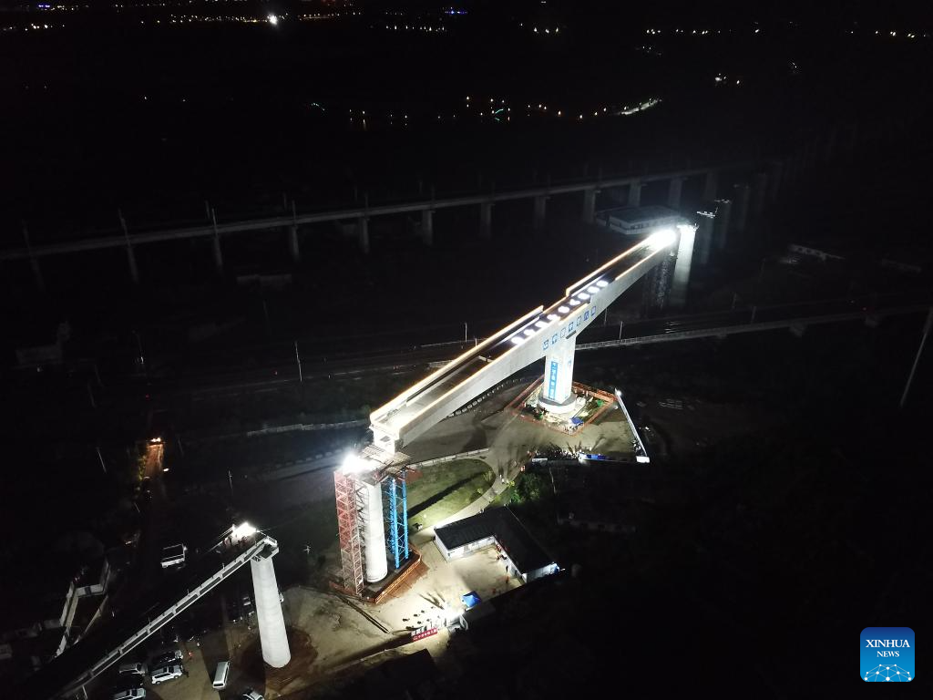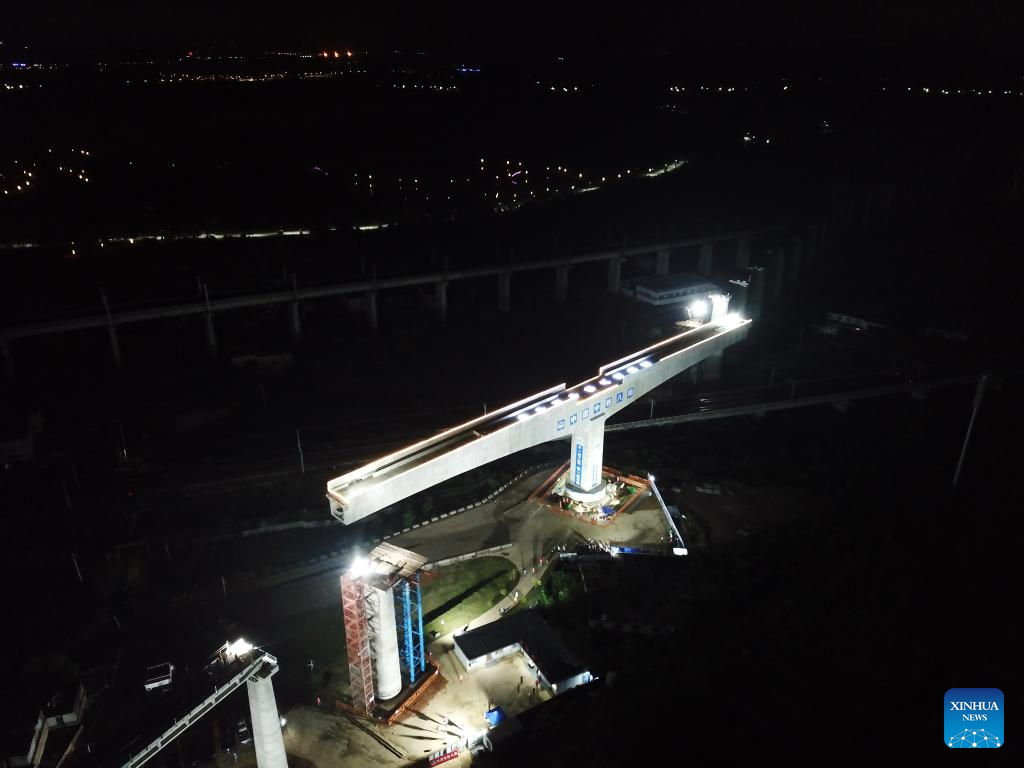 This aerial photo taken on Aug. 25, 2023 shows the construction site of a swivel bridge along the Guiyang-Nanning High-speed Railway in Gui'an New District, southwest China's Guizhou Province. The girder of this swivel bridge rotated 41 degrees on Friday to its targeted position, successfully crossing the Shanghai-Kunming High-speed Railway which has been open to traffic. (Xinhua/Liu Xu)