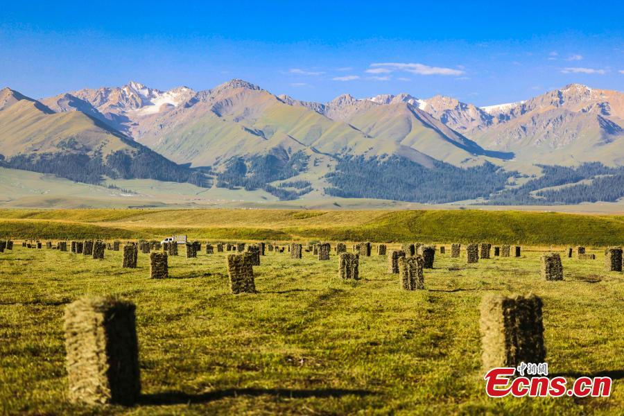 Harvested grasses are piled up on Nalati grassland in Xinjiang Uyghur Autonomous Region. (Photo: China News Service/Zhang Wenting)