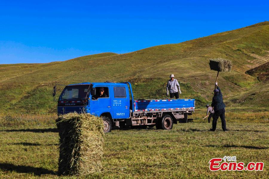 A herdsman loads bales of hay to a truck on Nalati grassland in Xinjiang Uygur Autonomous Region. (Photo: China News Service/Zhang Wenting)