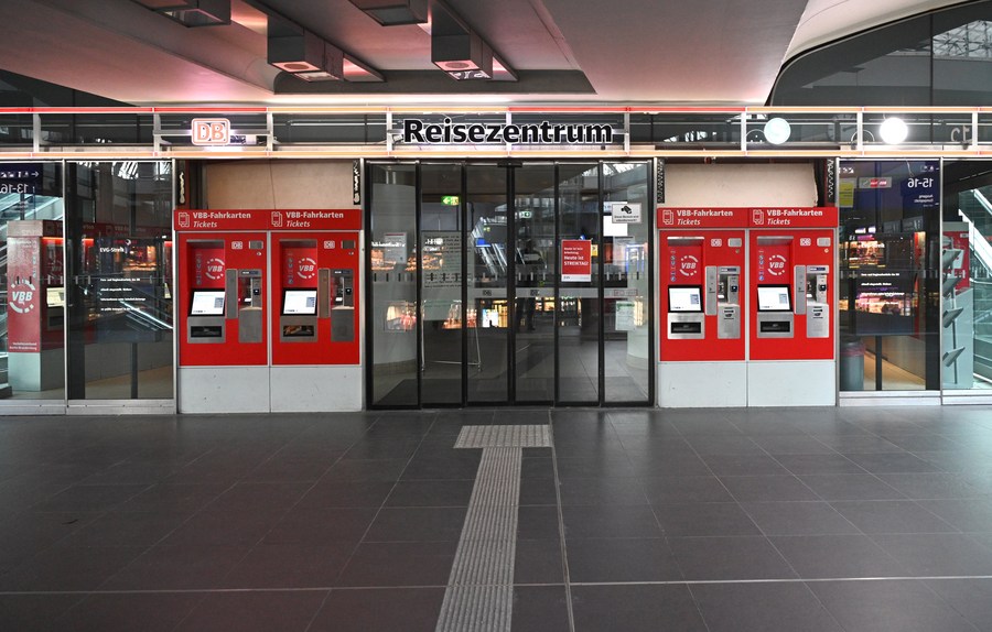 A travel center of Berlin Central Train Station is seen shut down in Berlin, Germany, on March 27, 2023. (Photo by Stefan Zeitz/Xinhua)