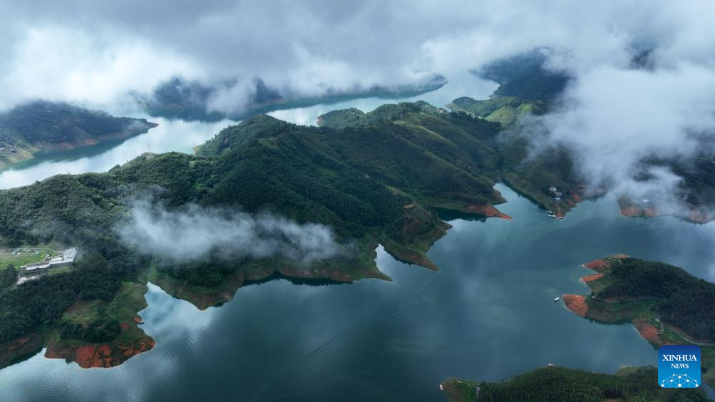 This aerial photo taken on Aug. 25, 2023 shows the scenery of Wanfeng Lake in Xingyi City of Qianxinan Buyi and Miao Autonomous Prefecture, southwest China's Guizhou Province. Qianxinan Buyi and Miao Autonomous Prefecture in Guizhou is rich in ecotourism resources and the local government has been promoting its tourism industry in recent years for better rural development. (Xinhua/Yang Ying)