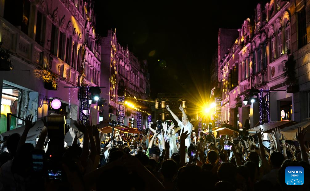 Tourists watch performance at the Qilou old street in Haikou, south China's Hainan Province, Aug. 22, 2023. (Xinhua/Yang Guanyu)