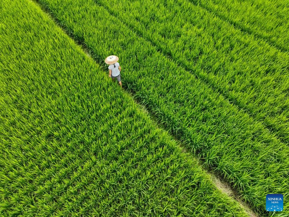 This aerial photo taken on Aug. 26, 2023 shows a farmer checking the growth of paddy rice in Daoxian County of Yongzhou, central China's Hunan Province. (Photo by Jiang Keqing/Xinhua)
