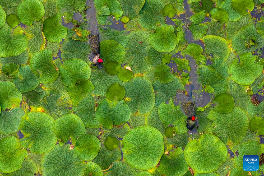 This aerial photo taken on Aug. 26, 2023 shows farmers harvesting gorgon fruit at Shenyu Village of Taizhou City, east China's Jiangsu Province. (Photo by Yan Yuming/Xinhua)
