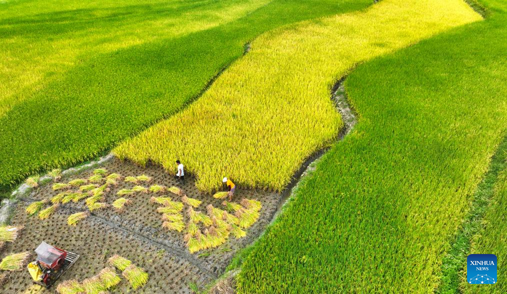 This aerial photo taken on Aug. 25, 2023 shows villagers harvesting paddy rice at Xiama Village of Chenzhou City, central China's Hunan Province. (Photo by Zhou Xiuyuchun/Xinhua)