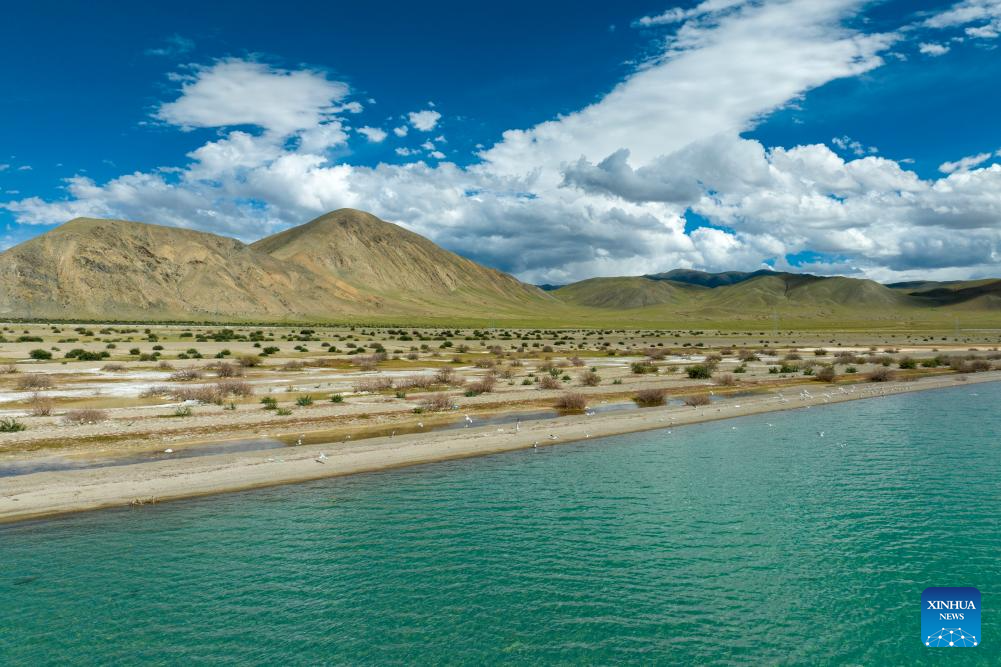 This aerial photo taken on Aug. 25, 2023 shows the scenery of a lake at Ge'gyai County of Ngari Prefecture, in southwest China's Tibet Autonomous Region. (Photo by Tenzin Norbu/Xinhua)