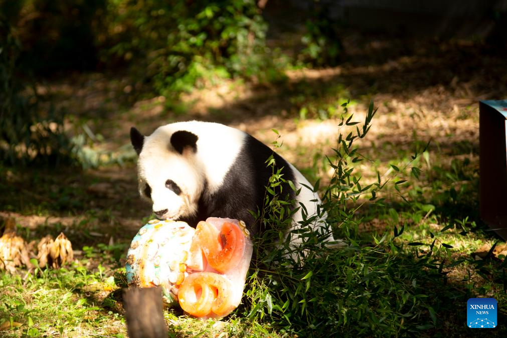 Giant panda Tian Tian enjoys an ice cake at Smithsonian's National Zoo in Washington, D.C., the United States, on Aug. 27, 2023. Giant panda Tian Tian celebrated his 26th birthday at the zoo on Sunday. (Photo by Winstead Barnes/Xinhua)