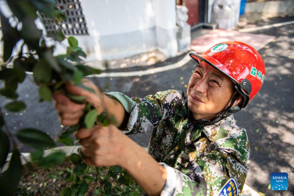 Huang Weigu weeds on a patrol road in Pingwan Village of Jingang Town, Liuyang City of central China's Hunan Province, Aug. 24, 2023. (Xinhua/Chen Sihan)