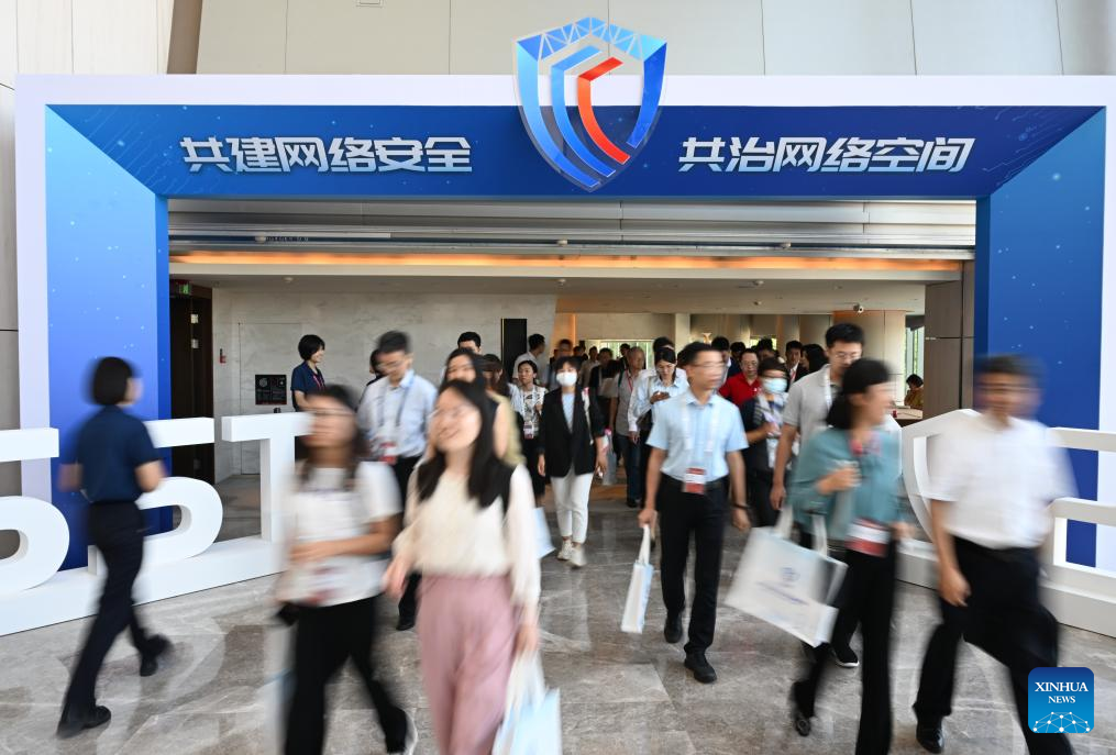 Participants walk out of the venue for the first Cyber Security Summit (Tianjin) in north China's Tianjin, Aug. 28, 2023. The first Cyber Security Summit (Tianjin) opened here on Monday. (Xinhua/Sun Fanyue)