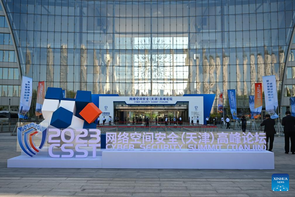 This photo shows the exterior view of the venue for the first Cyber Security Summit (Tianjin) in north China's Tianjin, Aug. 28, 2023. The first Cyber Security Summit (Tianjin) opened here on Monday. (Xinhua/Sun Fanyue)