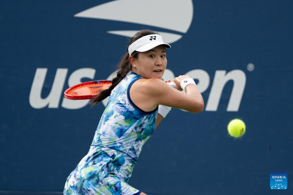 Zhu Lin of China hits a return during the women's singles first round match against Mayar Sherif of Egypt at the 2023 US Open tennis championships in New York, the United States, Aug. 28, 2023. (Xinhua/Liu Jie)