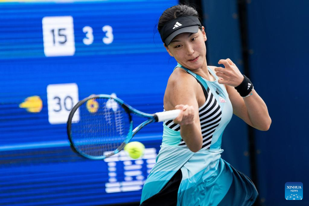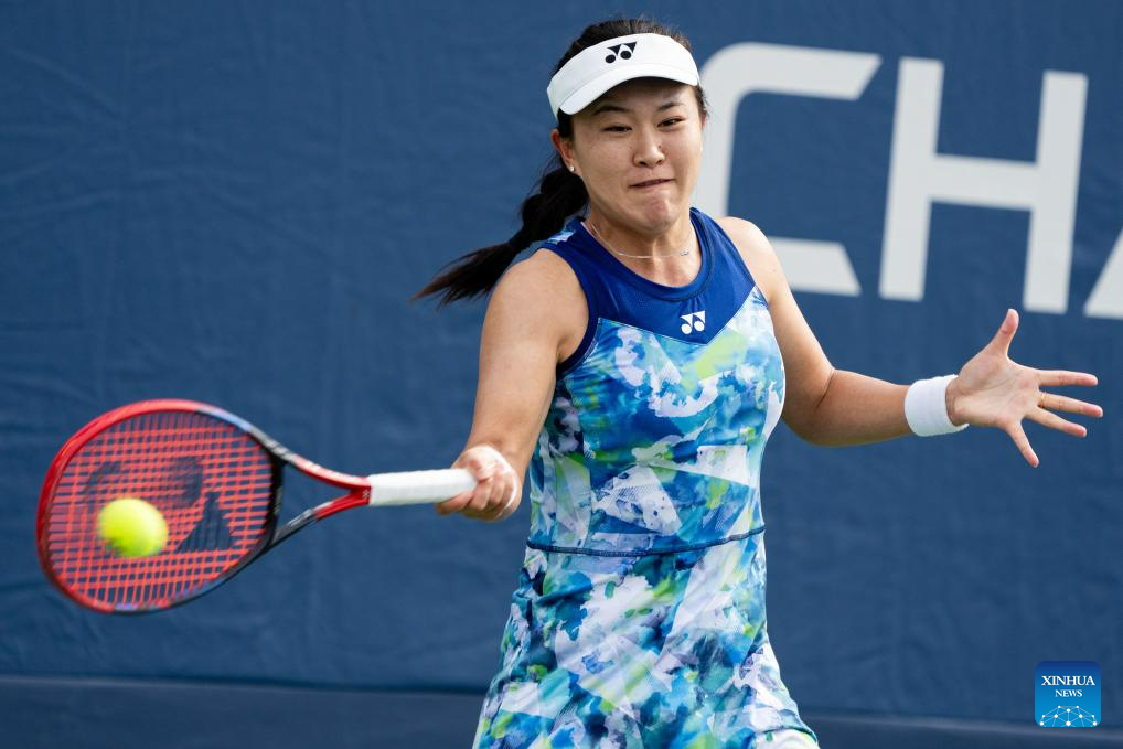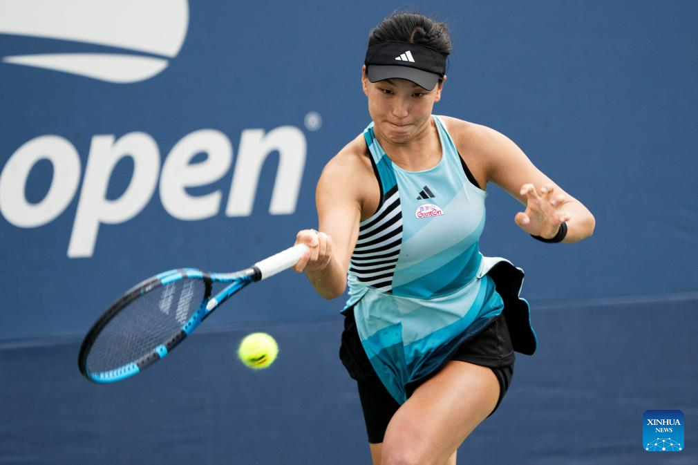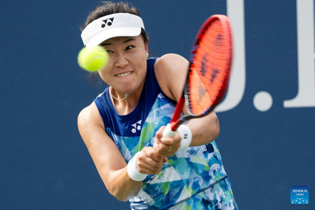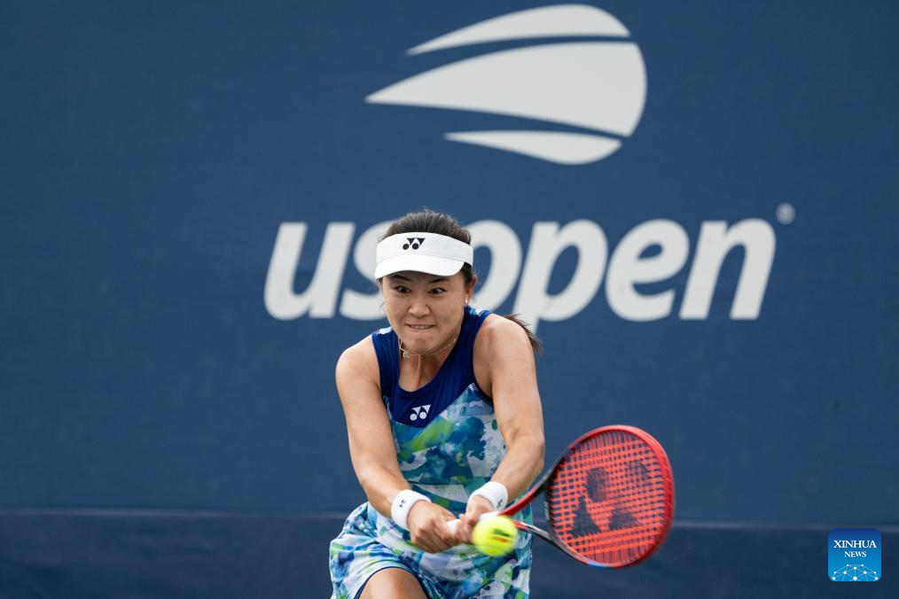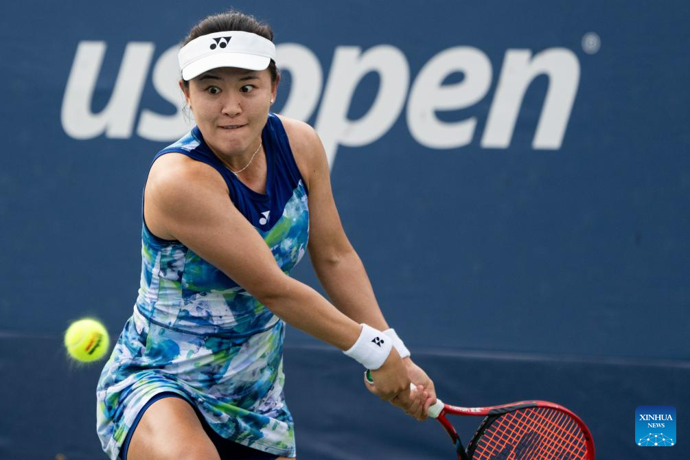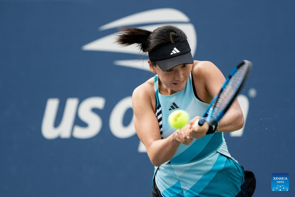 Wang Xinyu of China hits a return during the women's singles first round match against Katie Volynets of the United States at the 2023 US Open tennis championships in New York, the United States, Aug. 28, 2023. (Xinhua/Liu Jie)