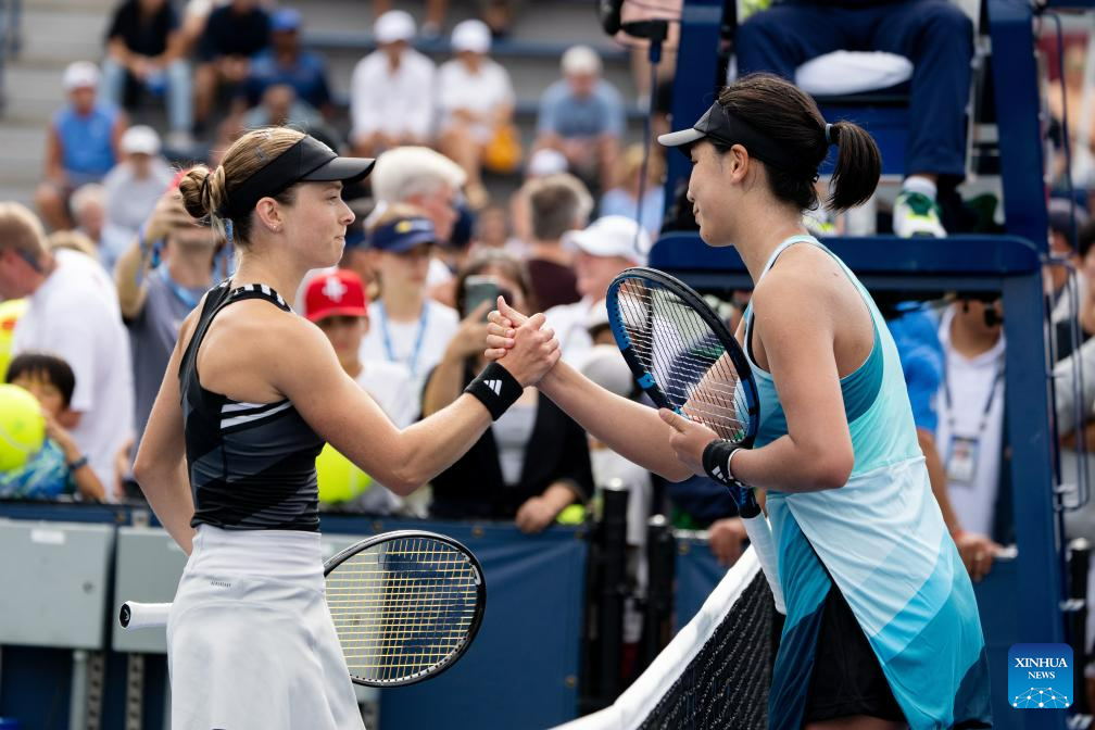 Wang Xinyu (R) of China shakes hands with Katie Volynets of the United States after their women's singles first round match at the 2023 US Open tennis championships in New York, the United States, Aug. 28, 2023. (Xinhua/Liu Jie)