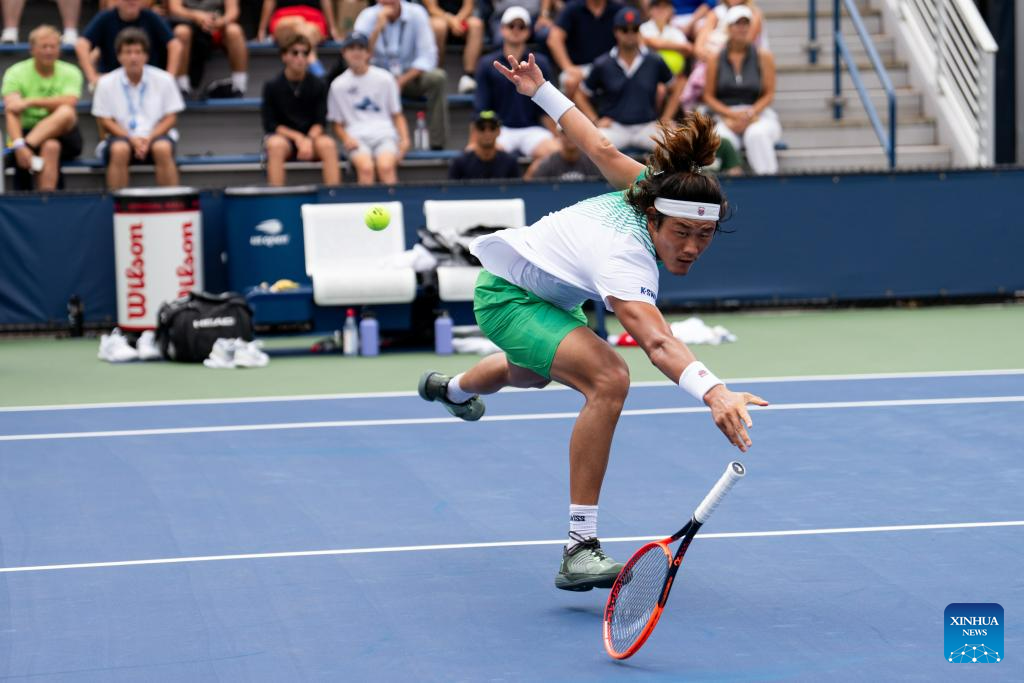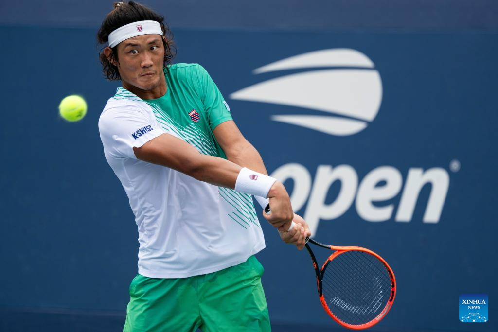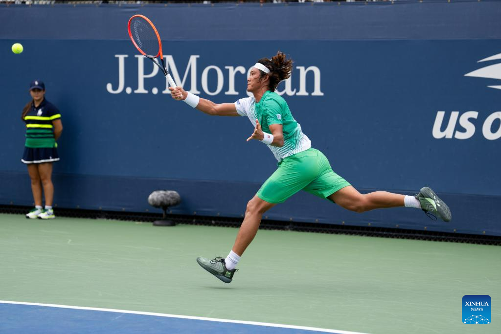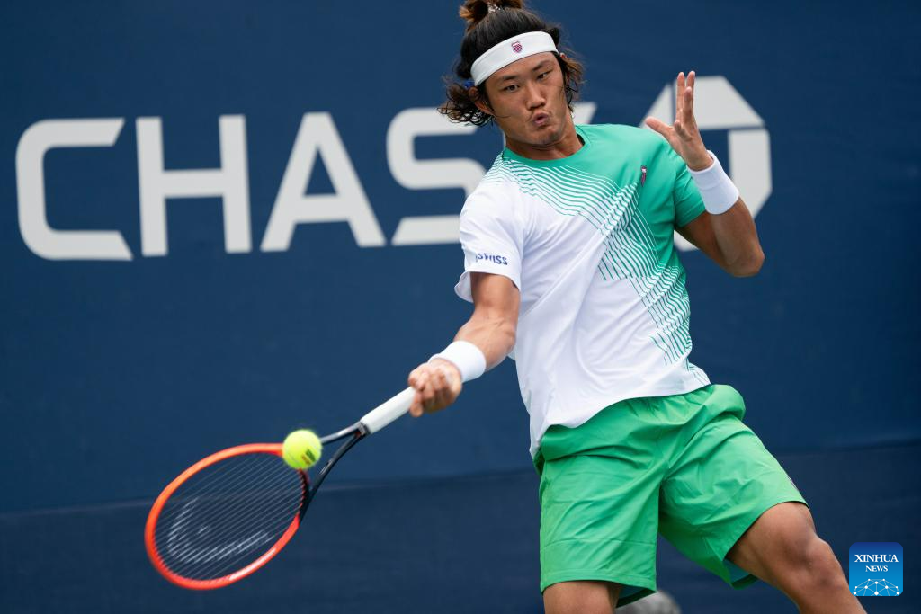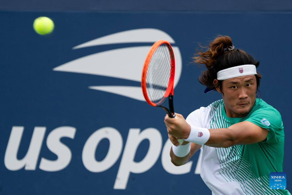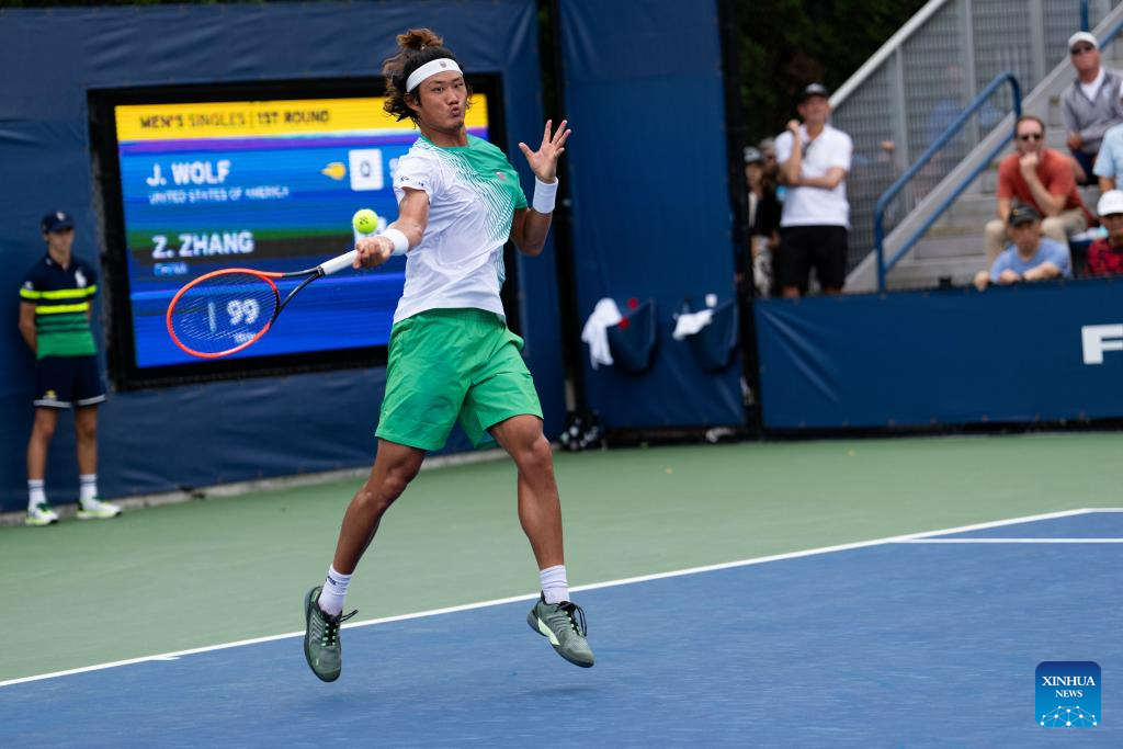 Zhang Zhizhen of China competes during the men's singles first round match against J.J. Wolf of the United States at the 2023 US Open tennis championships in New York, the United States, Aug. 28, 2023. (Xinhua/Liu Jie)