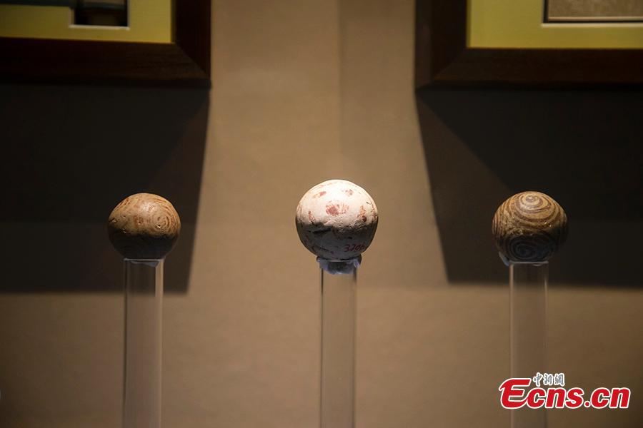 Sports-related ancient cultural relics are on display at the Hangzhou Asian Games Museum, Aug. 28, 2023. (Photo by Xiao Jian / For China News Service)