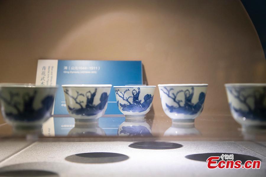 A set of porcelain cups with photos depicting martial arts is on display at the Hangzhou Asian Games Museum, Aug. 28, 2023. (Photo by Xiao Jian / For China News Service)