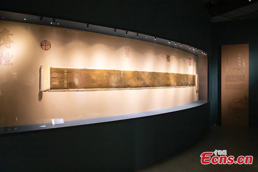 A scroll showing the historical origin of dragon boat racing in ancient China is on display at China Sports Culture Exhibition, Aug. 28, 2023. (Photo by Xiao Jian / For China News Service)