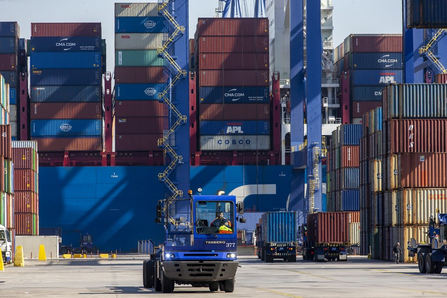 A driver works at the container terminal III in Piraeus port, Greece, Feb. 16, 2023. (Xinhua/Marios Lolos)