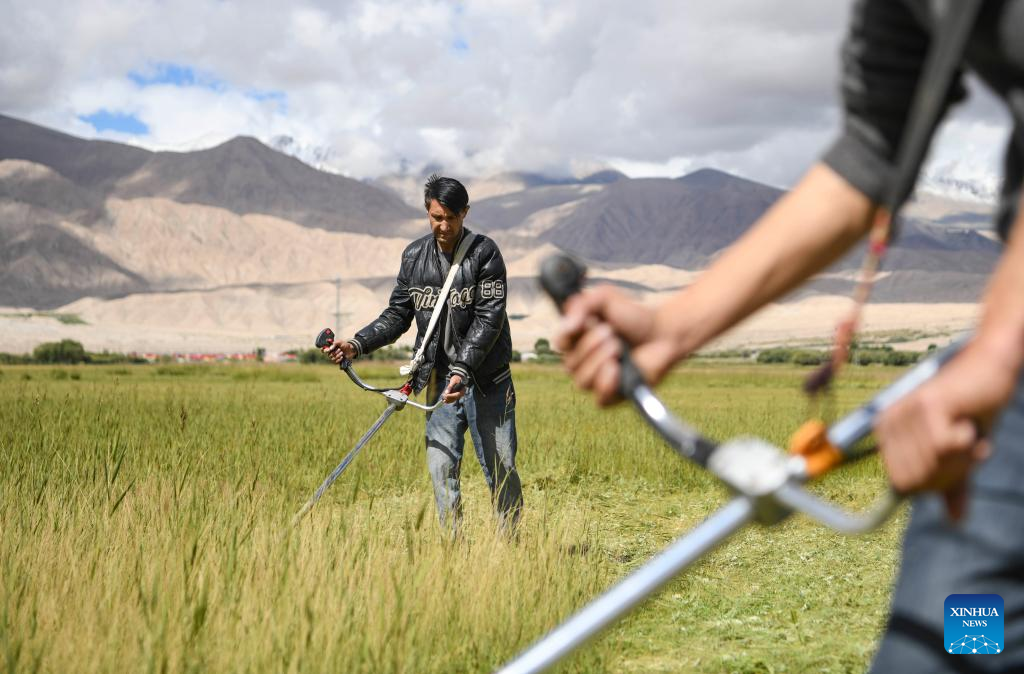 Herdsmen adjust and test equipment to reap forage grass in Taxkorgan Tajik Autonomous County, northwest China's Xinjiang Uygur Autonomous Region, Aug. 28, 2023. August and September are the annual forage grass harvest season for people living in the pasturing area in Xinjiang. Herdsmen in Taxkorgan Tajik Autonomous County, which is to the east foot of the Pamirs, have been busily preparing winter forage for their livestock recently. (Xinhua/Hu Huhu)