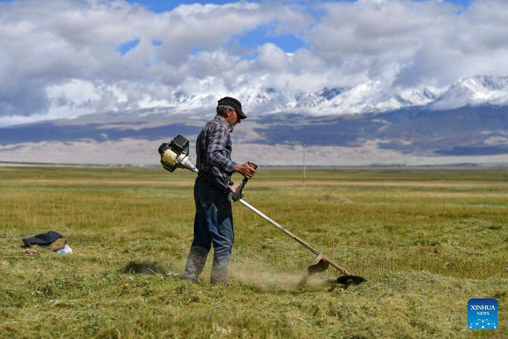 A herdsman reaps forage grass in Taxkorgan Tajik Autonomous County, northwest China's Xinjiang Uygur Autonomous Region, Aug. 27, 2023. August and September are the annual forage grass harvest season for people living in the pasturing area in Xinjiang. Herdsmen in Taxkorgan Tajik Autonomous County, which is to the east foot of the Pamirs, have been busily preparing winter forage for their livestock recently. (Xinhua/Hu Huhu)