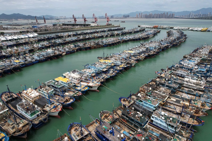 This aerial photo shows fishing boats at a dock in Xiamen, east China's Fujian Province, July 27, 2023. (Photo by Zeng Demeng/Xinhua)