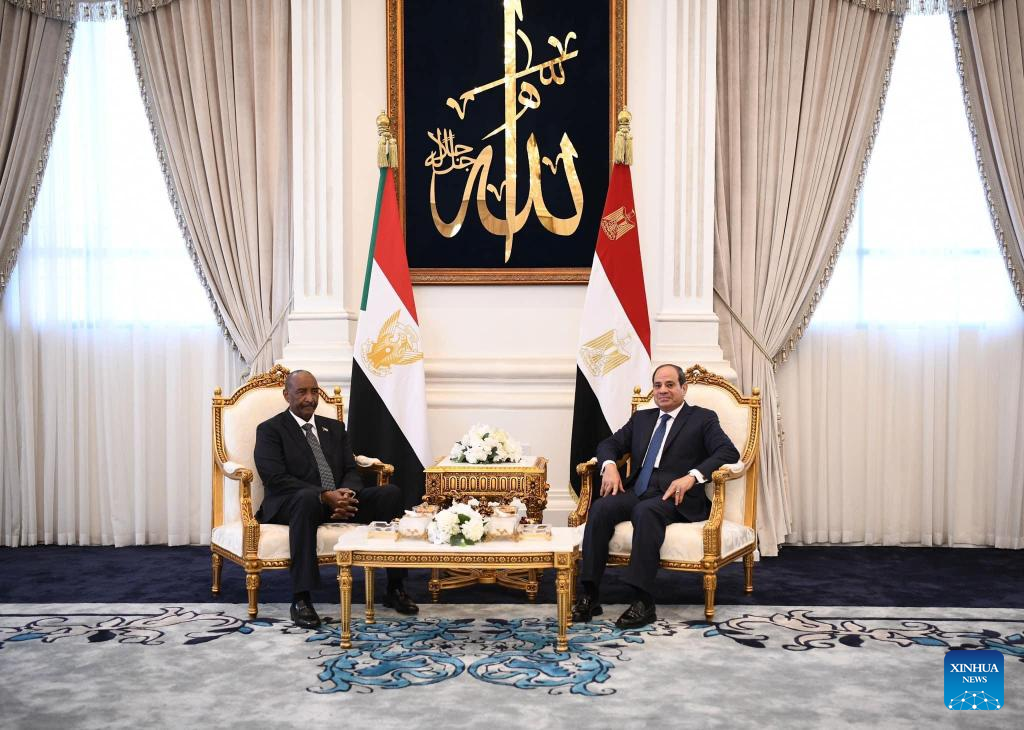 Egyptian President Abdel-Fattah al-Sisi (R) meets with visiting Chairman of Sudan's Sovereign Council Abdel Fattah Al-Burhan, also the general commander of the Sudanese Armed Forces, in New Alamein, Egypt, Aug. 29, 2023. Egyptian President Abdel-Fattah al-Sisi and visiting Chairman of Sudan's Sovereign Council Abdel Fattah Al-Burhan on Tuesday discussed bilateral ties and the latest developments in the Sudanese crisis. (Egyptian Presidency/Handout via Xinhua)