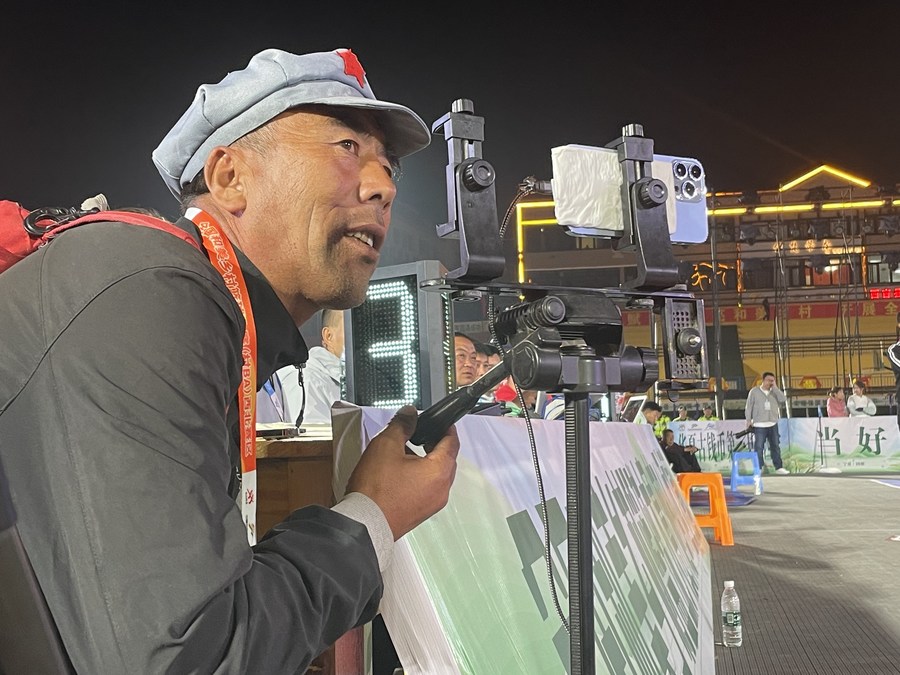 Wang Fengqiang is conducting livestreaming sessions for the "CunBA" match in Xiji County, northwest China's Ningxia Hui Autonomous Region on Aug. 27, 2023. (Xinhua/Bai Ge)