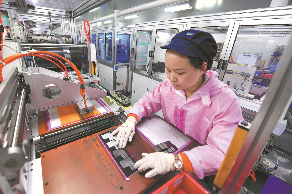 An employee works on the production line of graphene products at a manufacturer in Changzhou, Jiangsu province. LI BO/XINHUA
