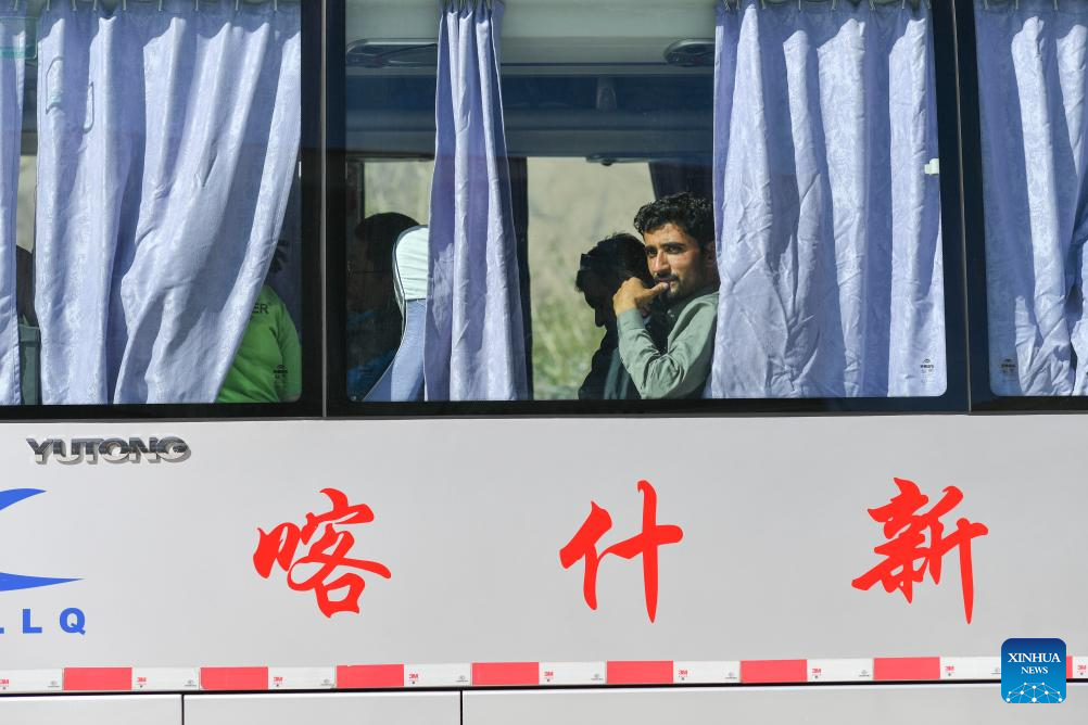 People from Pakistan sit on an international bus at the Kunjirap Pass in Taxkorgan Tajik Autonomous County, northwest China's Xinjiang Uygur Autonomous Region, Aug. 29, 2023. After it resumed passenger customs clearance on April 3, the Kunjirap Pass has recorded over 21,000 inbound and outbound passengers. (Xinhua/Hu Huhu)