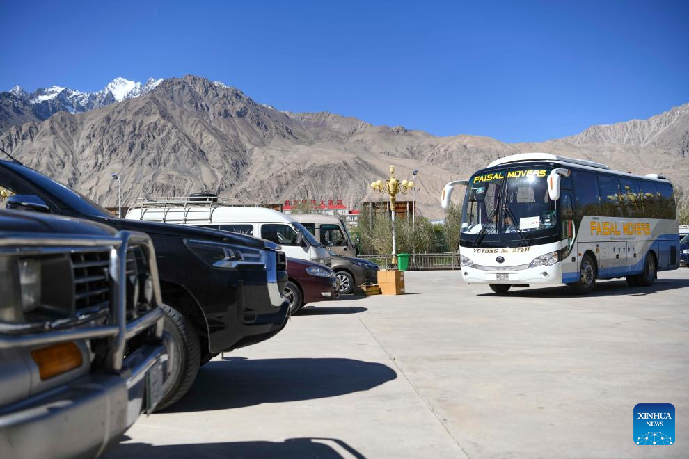 A bus from Pakistan arrives at the Kunjirap Pass in Taxkorgan Tajik Autonomous County, northwest China's Xinjiang Uygur Autonomous Region, Aug. 29, 2023. After it resumed passenger customs clearance on April 3, the Kunjirap Pass has recorded over 21,000 inbound and outbound passengers. (Xinhua/Hu Huhu)