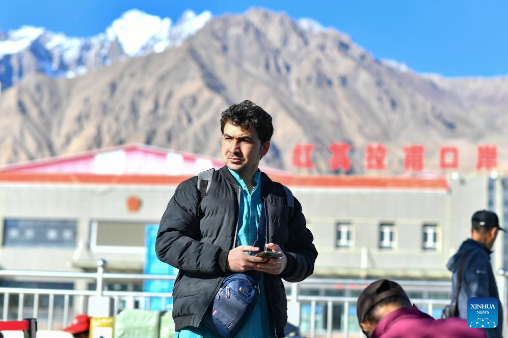 A traveler from Pakistan waits for clearance at the Kunjirap Pass in Taxkorgan Tajik Autonomous County, northwest China's Xinjiang Uygur Autonomous Region, Aug. 29, 2023. After it resumed passenger customs clearance on April 3, the Kunjirap Pass has recorded over 21,000 inbound and outbound passengers. (Xinhua/Hu Huhu)