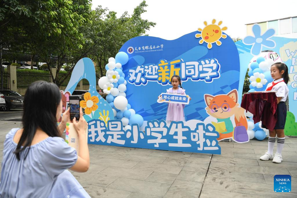A first grader poses for pictures at the Yajule primary school in Nan'an District of southwest China's Chongqing, Aug. 30, 2023. (Xinhua/Wang Quanchao)