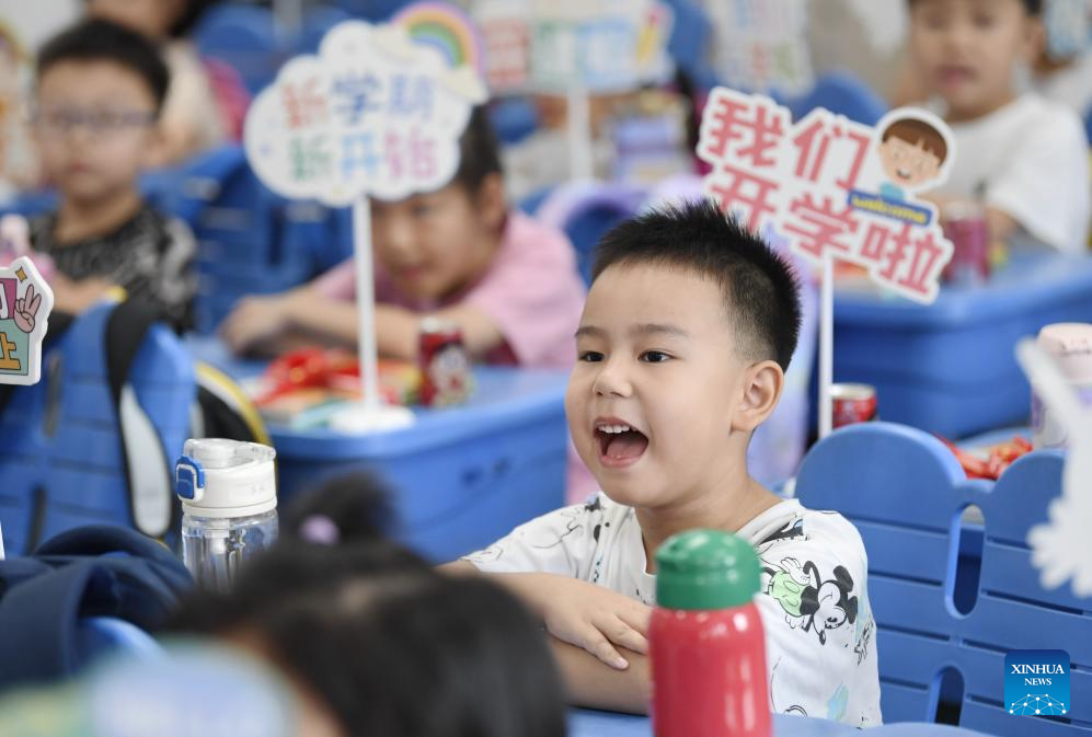 Children newly admitted to school listen to their teacher's lecture at the No. 1 primary school in Xianju County of Taizhou, east China's Zhejiang Province, Aug. 30, 2023. (Photo by Wang Huabin/Xinhua)