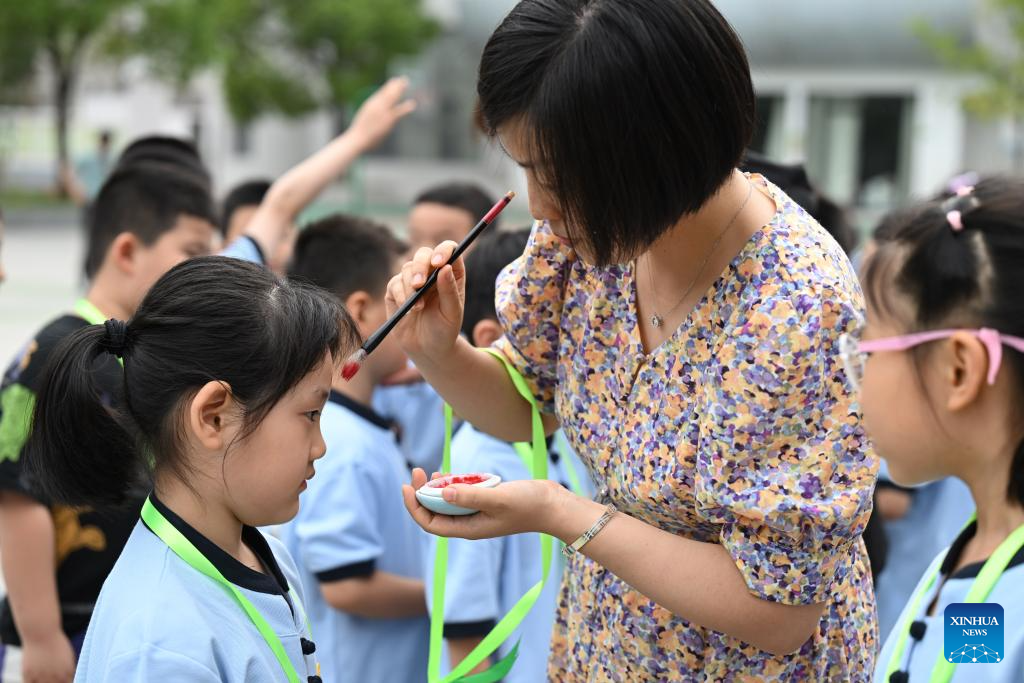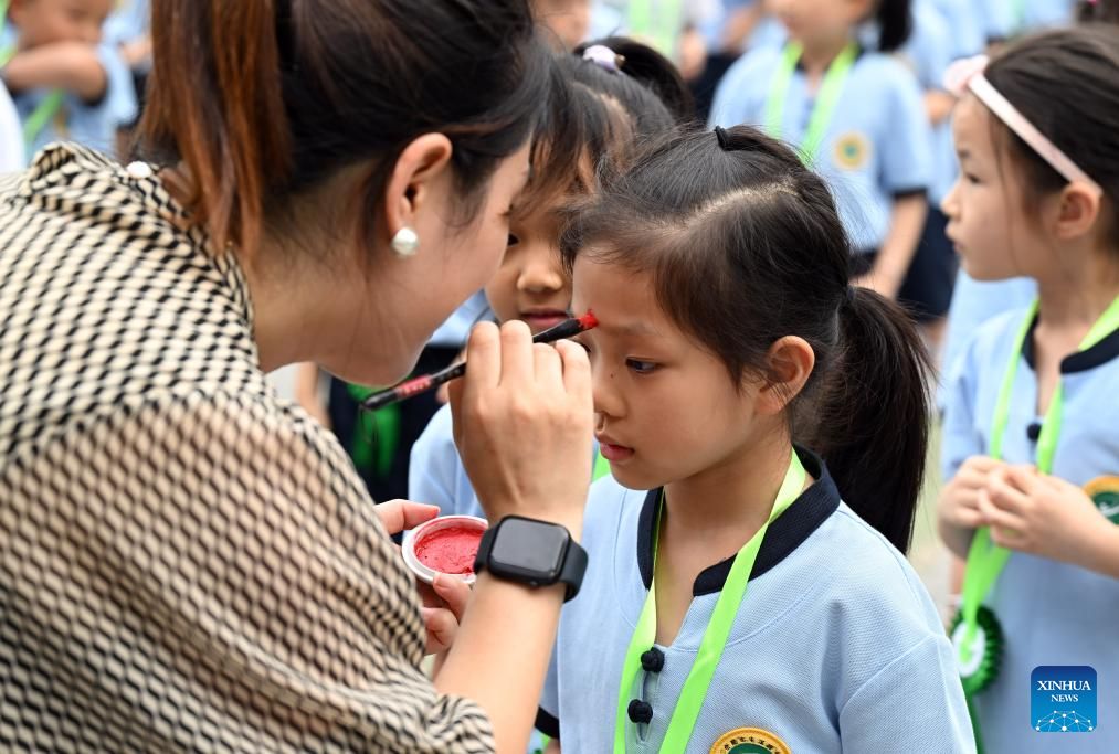 A teacher paints a red dot on the foreheads of children newly admitted to school at Tunxi road primary school in Hefei, east China's Anhui Province, Aug. 30, 2023. The red dot represents the opening of the wisdom eye in China's traditional culture. (Xinhua/Zhou Mu)