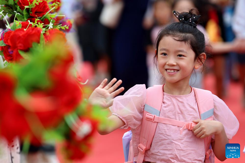 A little girl in the first grade waves to her teachers at Donghu primary school in Zaozhuang, east China's Shandong Province, Aug. 30, 2023. (Photo by Sun Zhongzhe/Xinhua)