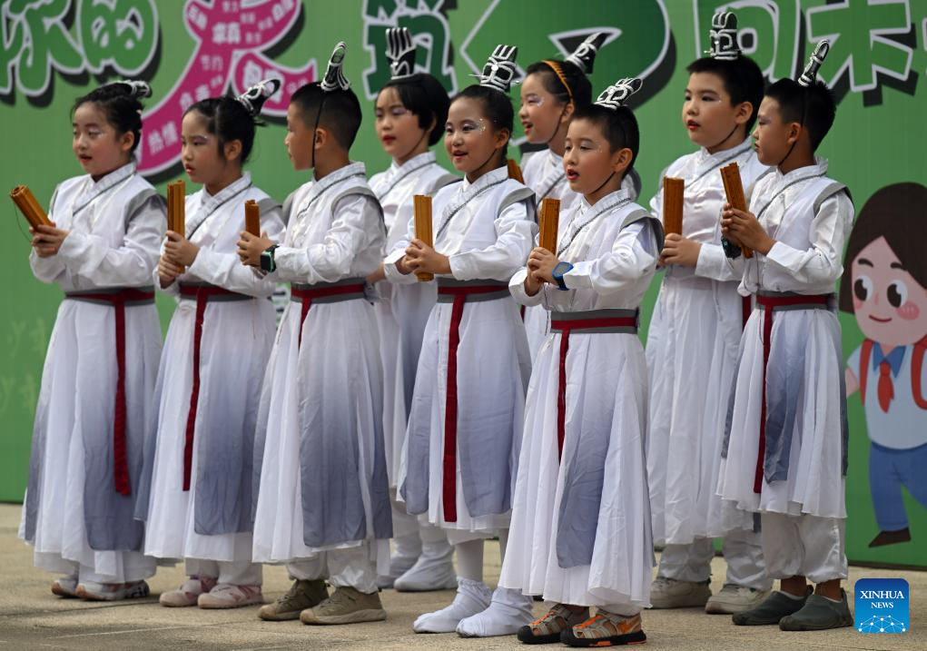 Students read aloud the Thousand Character Classic, a Chinese poem used as a primer for teaching Chinese characters to children in ancient China, in Tunxi road primary school of Hefei, east China's Anhui Province, Aug. 30, 2023. (Xinhua/Zhou Mu)