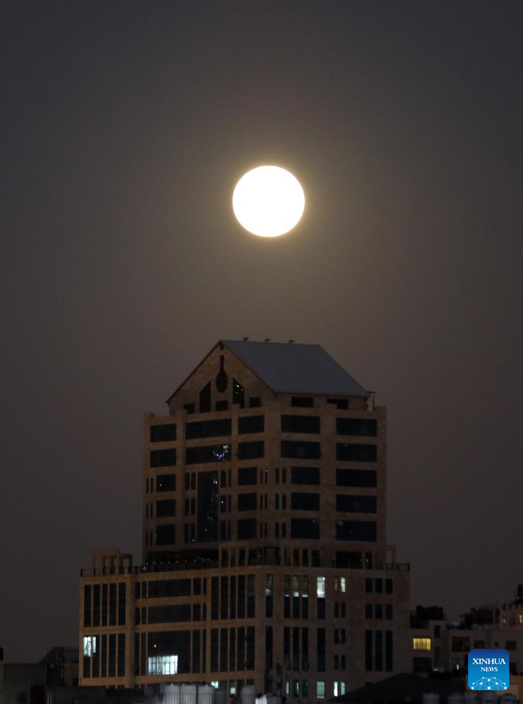A full moon is seen in the sky over the West Bank city of Nablus, on Aug. 30, 2023. (Photo by Ayman Nobani/Xinhua)