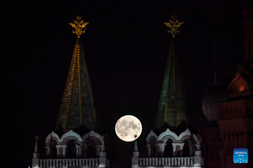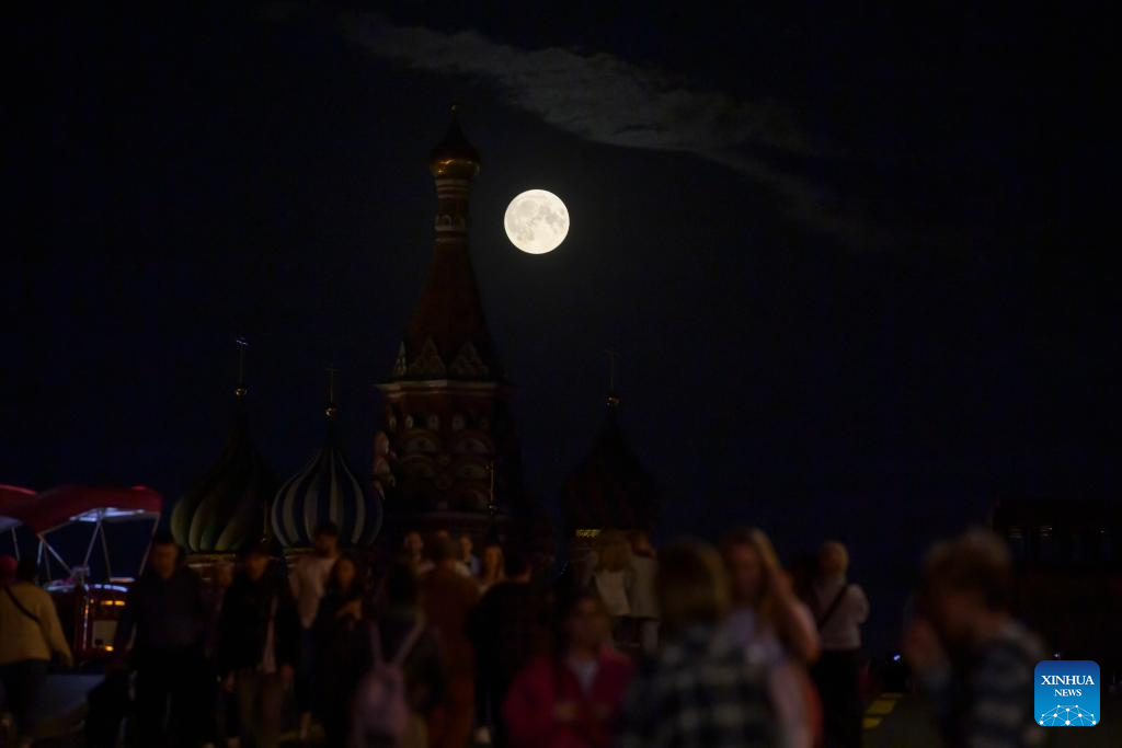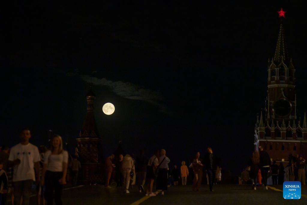 A full moon is seen over Red Square in Moscow, Russia, on Aug. 30, 2023. (Photo by Alexander Zemlianichenko Jr/Xinhua)