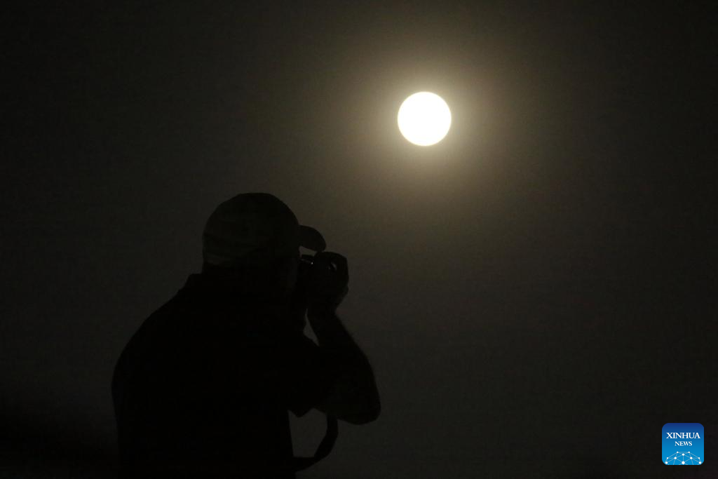 A man takes a photo of a full moon in the sky over Baghdad, Iraq, on Aug. 30, 2023. (Xinhua/Khalil Dawood)