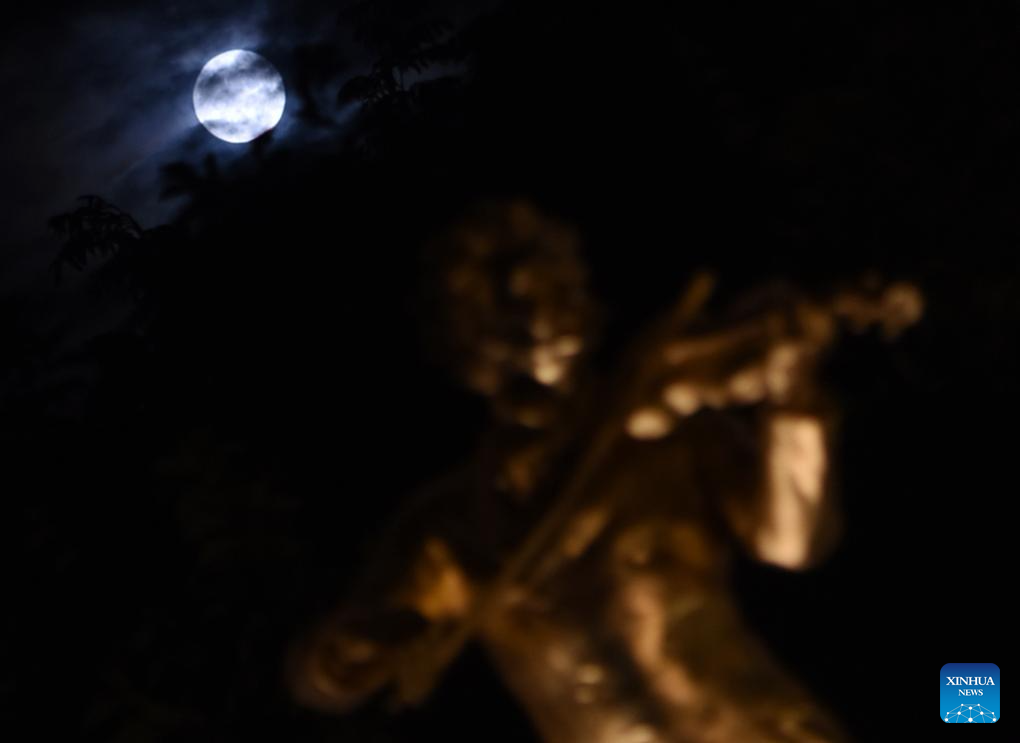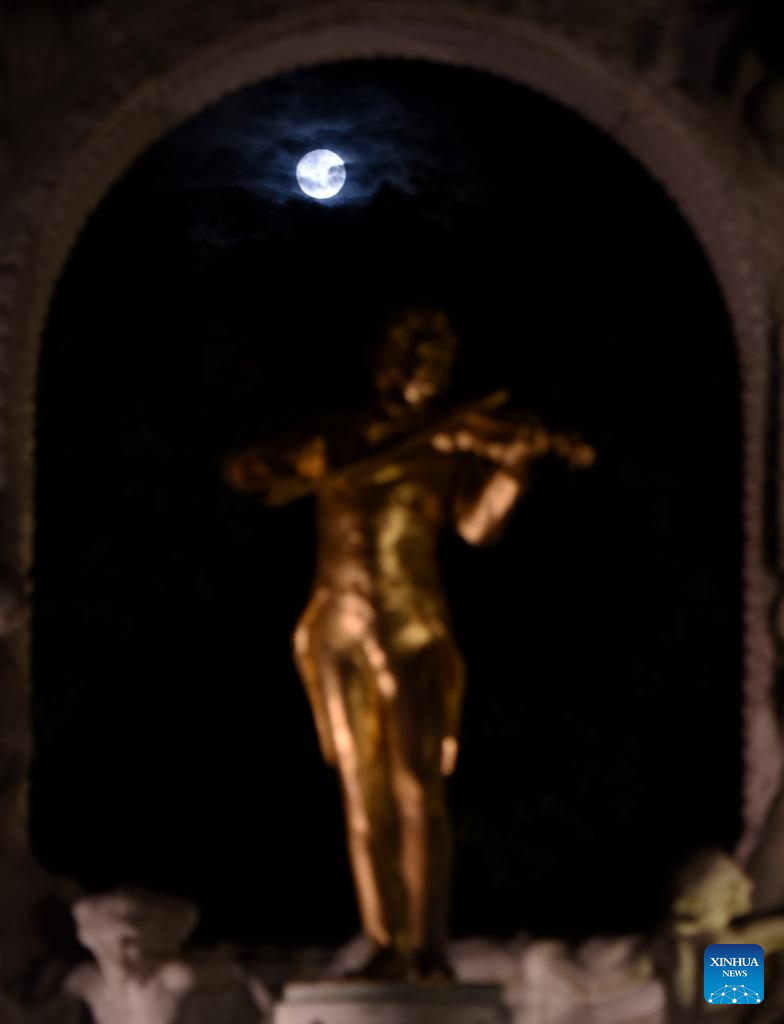 Photo taken on Aug. 30, 2023 shows a full moon over the Johann Strauss Monument in Vienna, Austria. (Xinhua/He Canling)