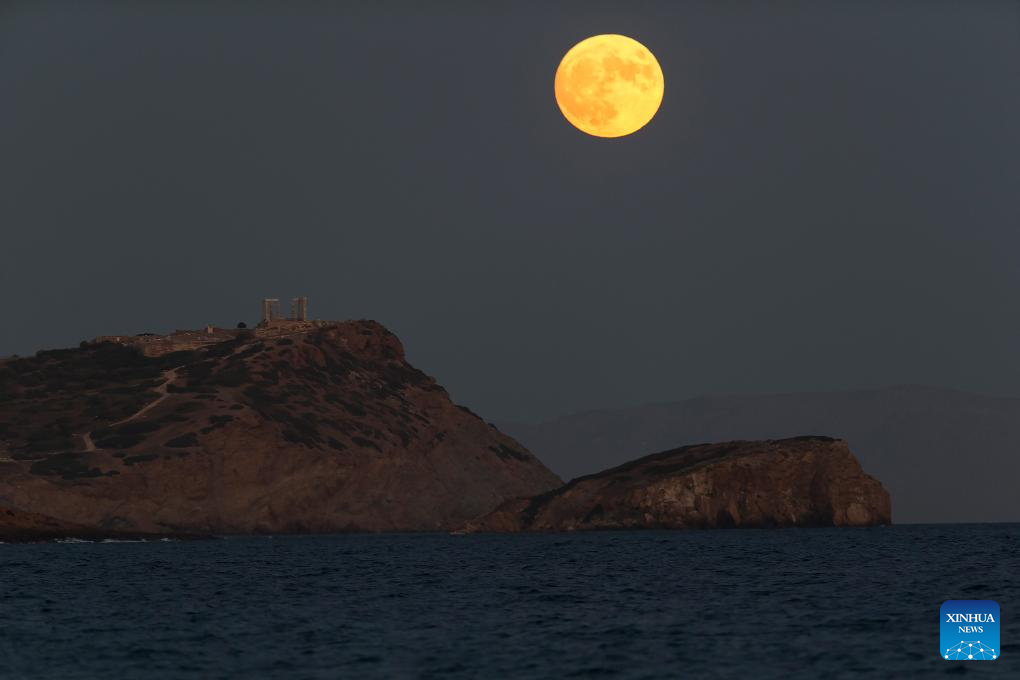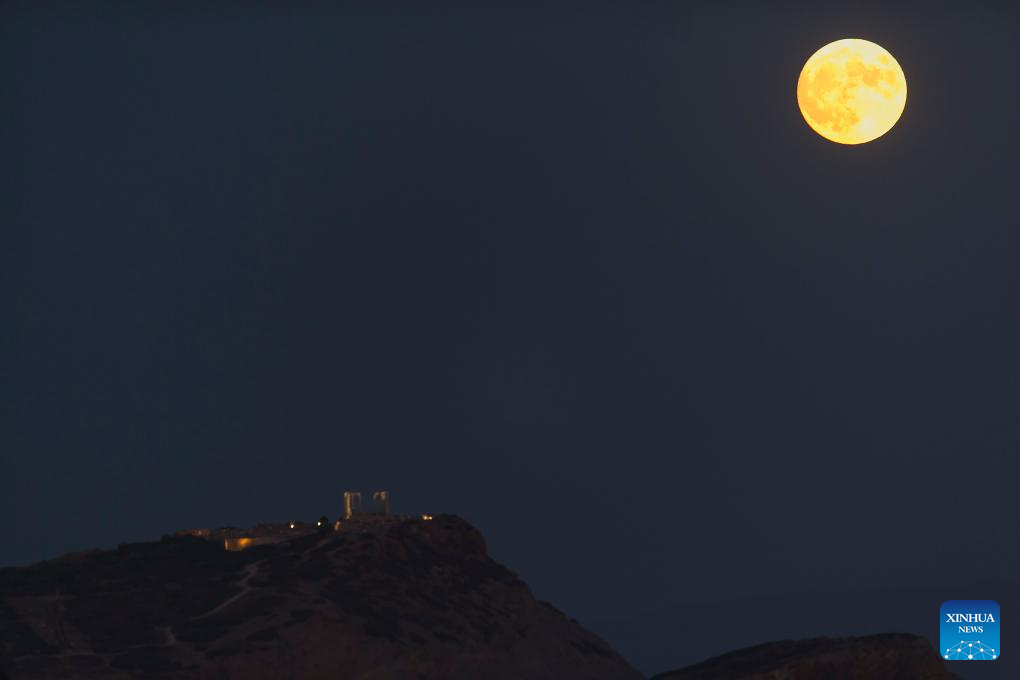 A full moon rises over the Temple of Poseidon at Cape Sounion, near Athens, Greece, on Aug. 30, 2023. (Xinhua/Marios Lolos)