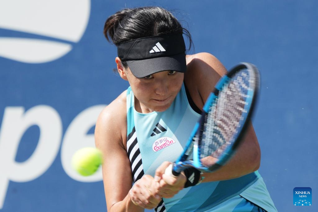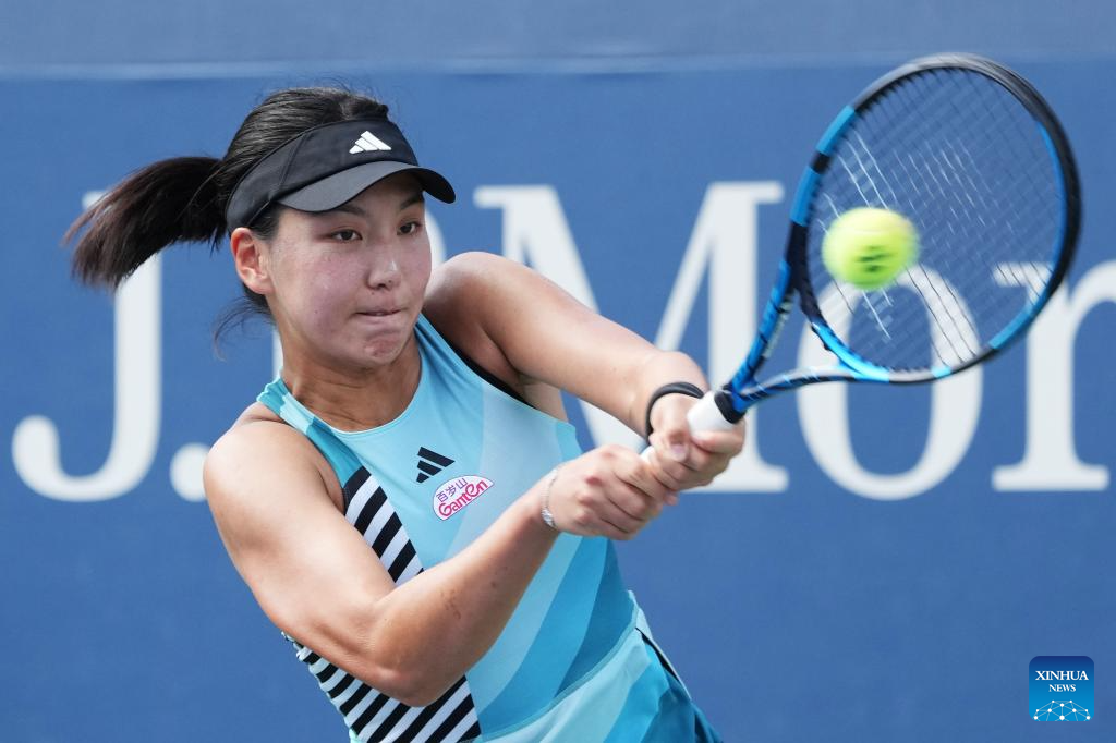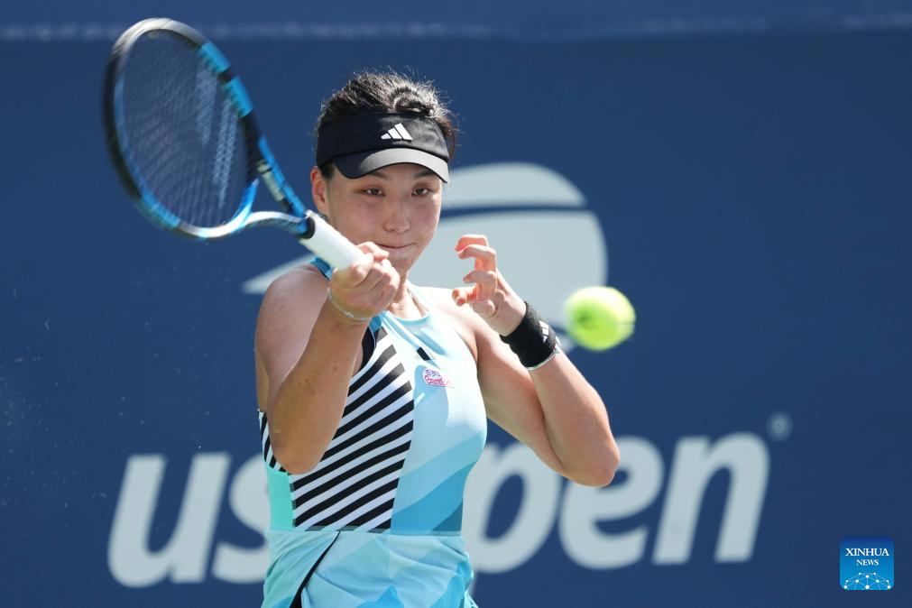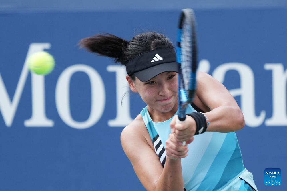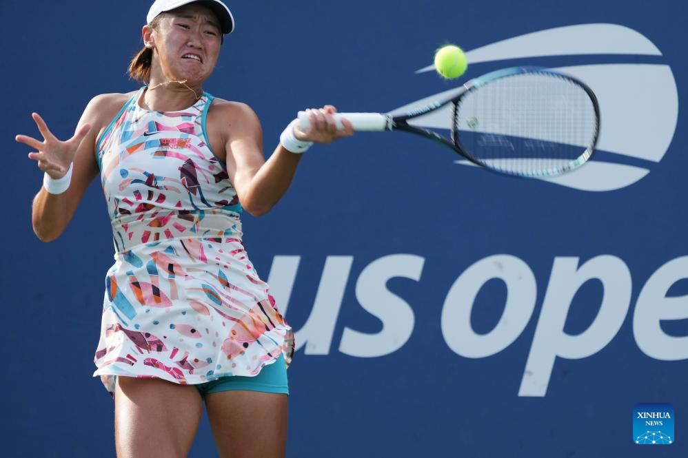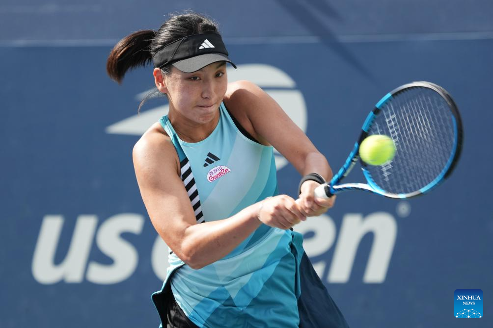 Wang Xiyu of China hits a return during the women's singles second round match against Bernarda Pera of the United States at the 2023 US Open tennis championships in New York, the United States, Aug. 30, 2023. (Xinhua/Liu Jie)