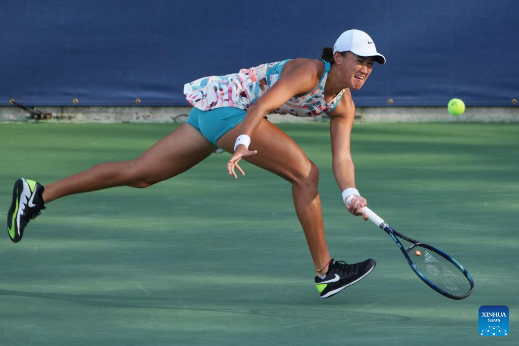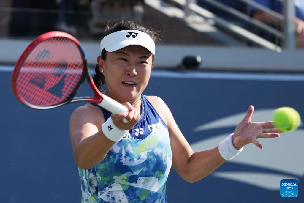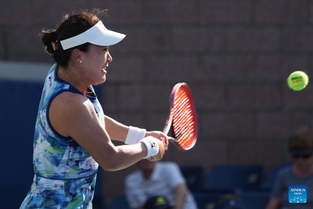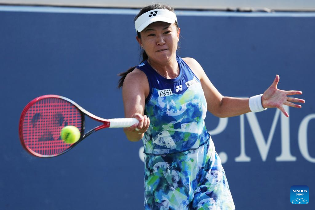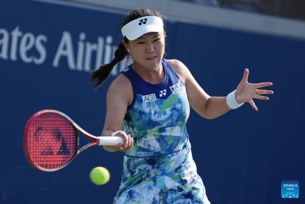 Wang Xiyu of China hits a return during the women's singles second round match against Bernarda Pera of the United States at the 2023 US Open tennis championships in New York, the United States, Aug. 30, 2023. (Xinhua/Liu Jie)