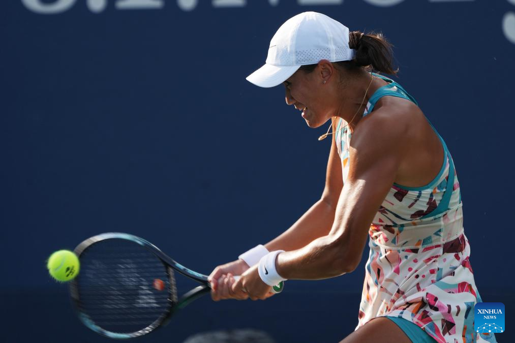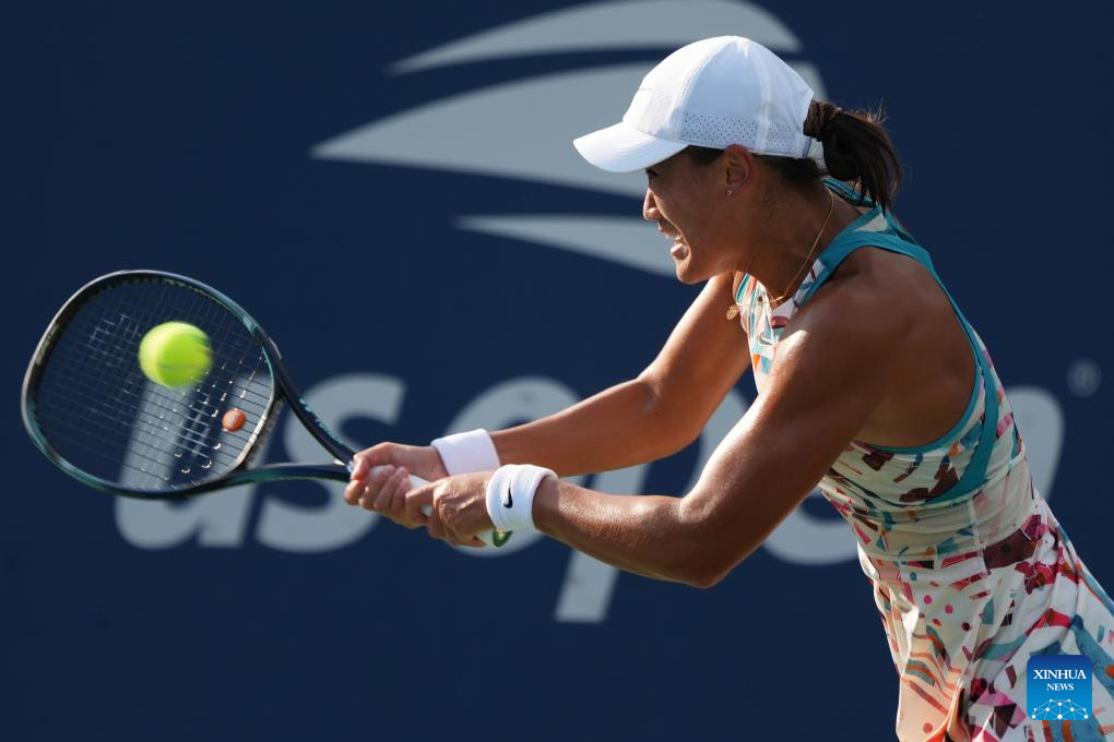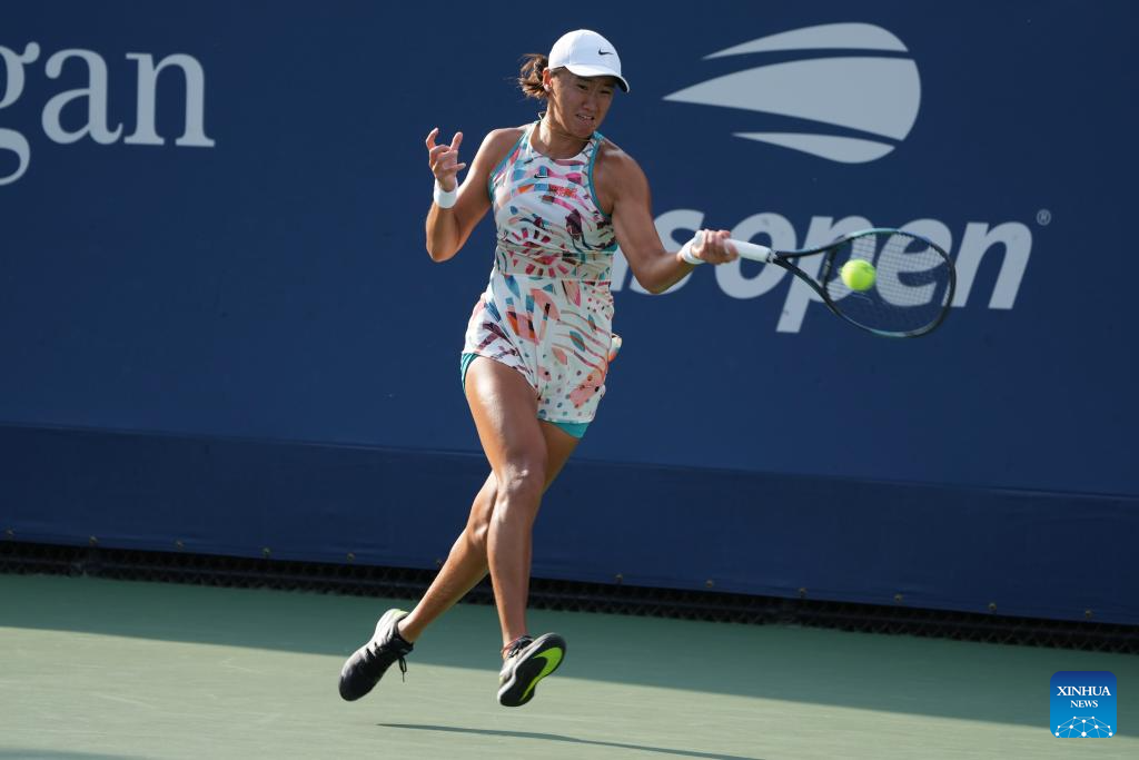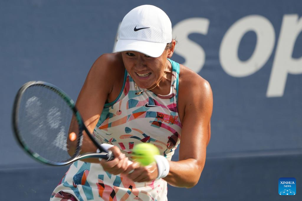Wang Xinyu of China hits a return during the women's singles second round match against Sara Sorribes Tormo of Spain at the 2023 US Open tennis championships in New York, the United States, Aug. 30, 2023. (Xinhua/Liu Jie)