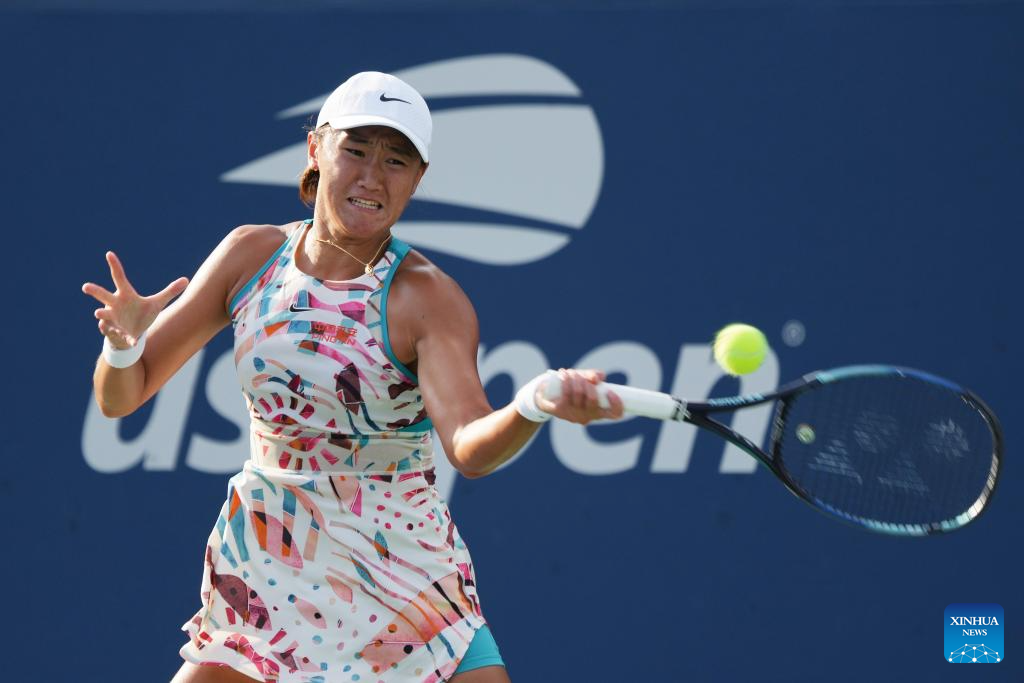 Zhu Lin of China hits a return during the women's singles second round match against Victoria Azarenka of Belarus at the 2023 US Open tennis championships in New York, the United States, Aug. 30, 2023. (Xinhua/Liu Jie)