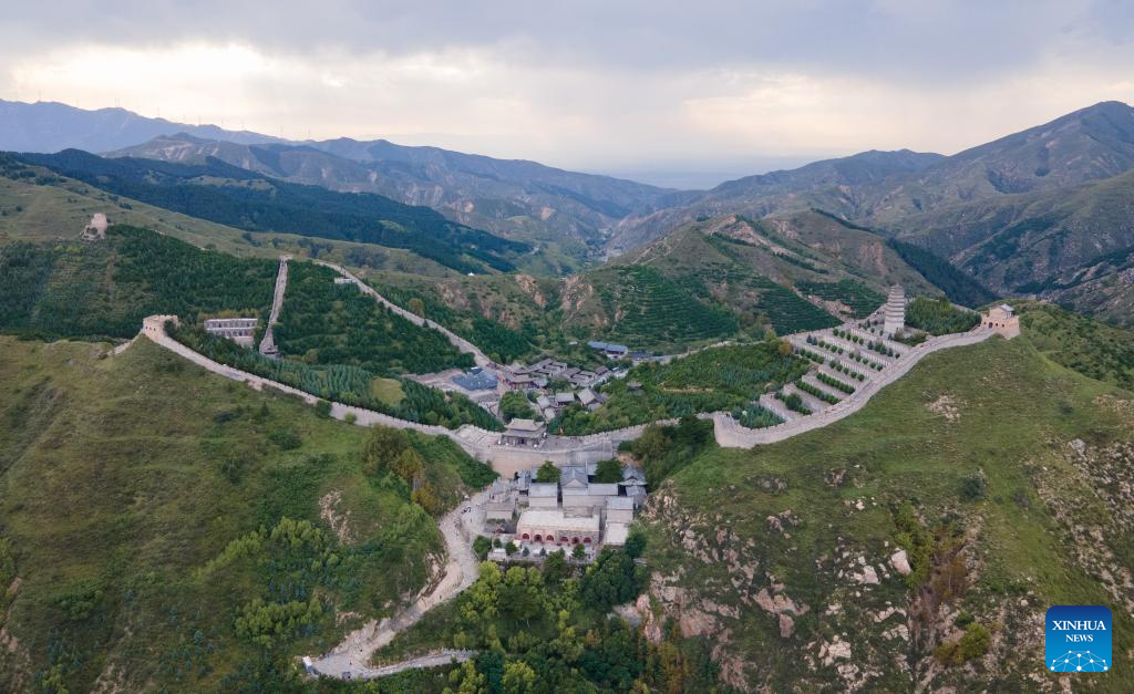 This aerial photo taken on Aug. 30, 2023 shows the Yanmen Pass in Daixian County, north China's Shanxi Province. The Yanmen Pass is a famed part of the Great Wall. The Great Wall, a UNESCO World Heritage Site, consists of many interconnected walls, some dating back 2,000 years. (Xinhua/Liu Jinhai)