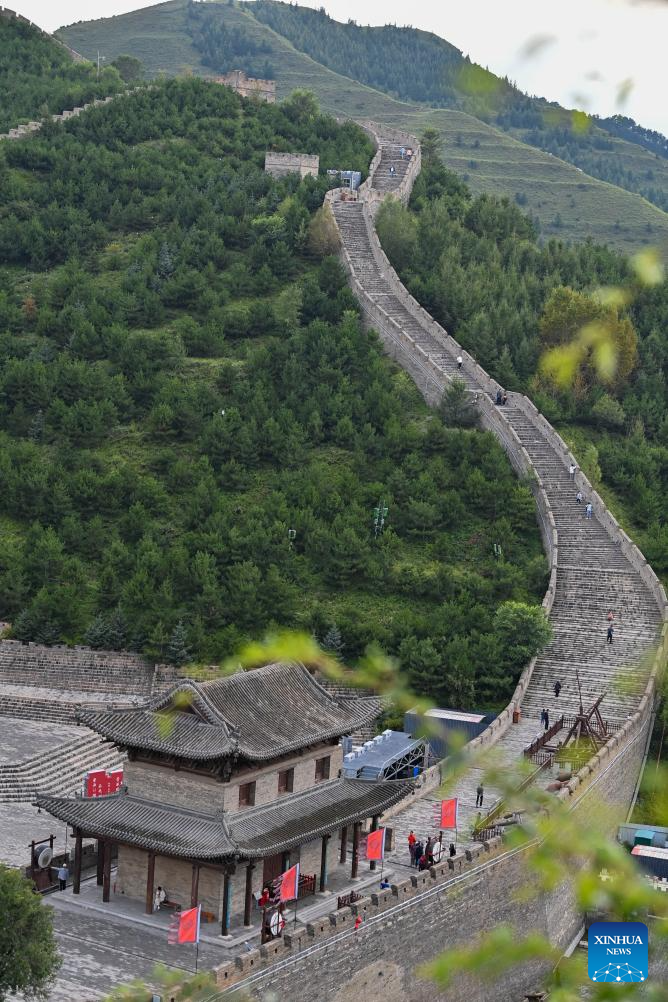 This photo taken on Aug. 29, 2023 shows people visiting the Yanmen Pass in Daixian County, north China's Shanxi Province. The Yanmen Pass is a famed part of the Great Wall. The Great Wall, a UNESCO World Heritage Site, consists of many interconnected walls, some dating back 2,000 years. (Xinhua/Yang Chenguang)