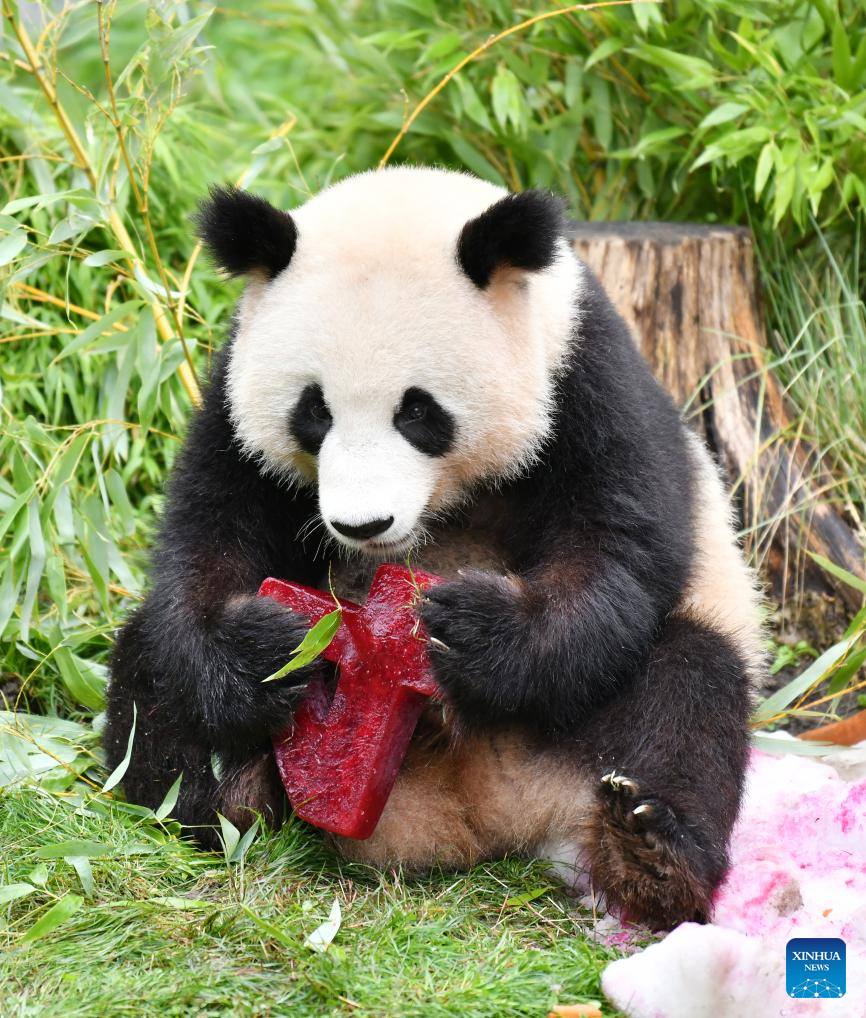 Giant panda Meng Xiang enjoys a "birthday cake" at Zoo Berlin in Berlin, capital of Germany, Aug. 31, 2023. The pair of giant pandas celebrated their fourth birthday in Zoo Berlin on Thursday. (Xinhua/Ren Pengfei)